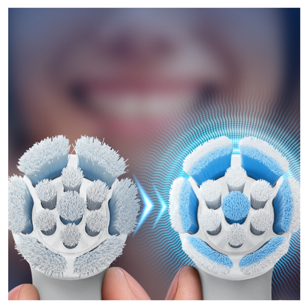 Wymienne końcówki do szczoteczek Oral-B iO Series Gentle Care łączą silne, lecz delikatne mikrowibracje z wyjątkową, okrągłym kształtem główki zaprojektowanej we współpracy z dentystami, zapewniając profesjonalne uczucie czystości każdego dnia. Końcówki Gentle Care, stworzone specjalnie z myślą o rączkach szczoteczek elektrycznych Oral-B iO, pomagają usuwać nawet do 100% więcej płytki bakteryjnej niż zwykła szczoteczka manualna, pozostawiając zęby czyste i lśniące. Końcówka Gentle Care zawiera do 4000 miękkich włókien oraz amortyzujący pierścień zewnętrzny, który precyzyjnie dopasowuje się do kształtu zębów i chroni dziąsła.