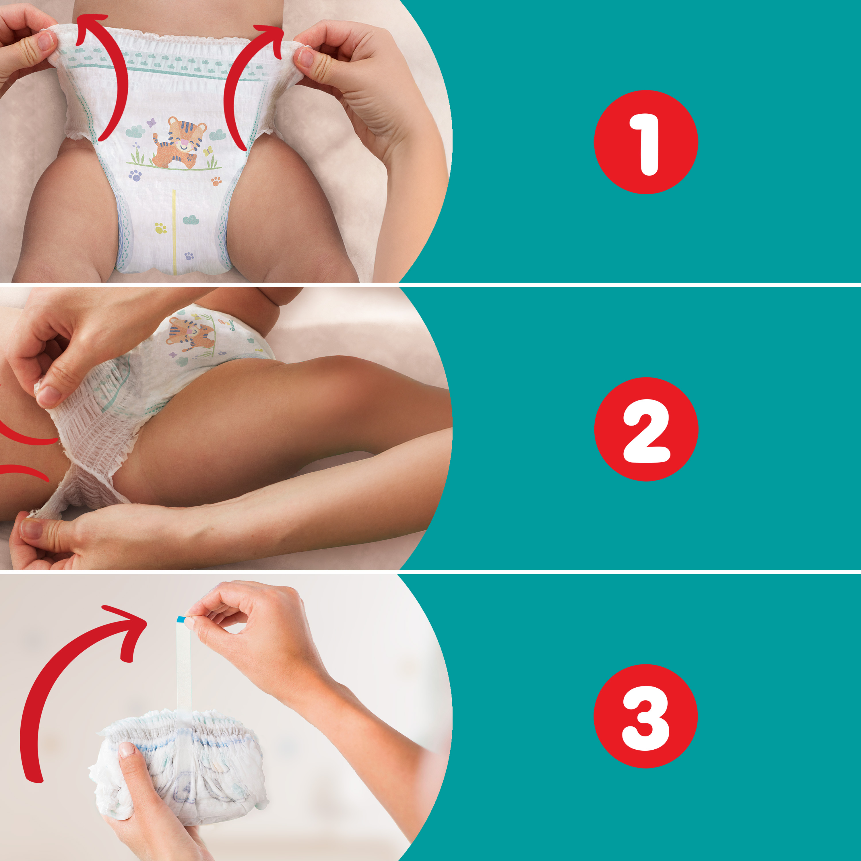 Podobnie jak wszystkie pieluchomajtki Pampers, Pampers Active Baby można łatwo zmienić, nawet gdy dziecko się wierci: wystarczy jeden ruch, aby je założyć. Żeby zdjąć pieluchomajtki, musisz tylko rozedrzeć ich boczki, a przed wyrzuceniem zwinąć je i zabezpieczyć taśmą.