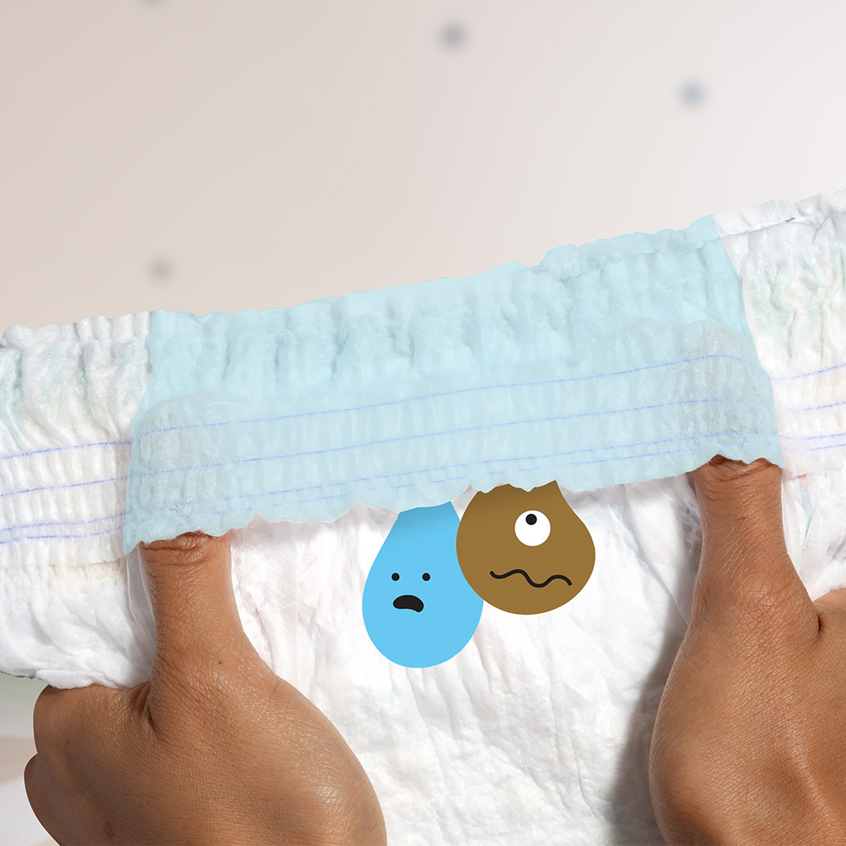 System Stop & Protect w pieluchomajtkach Pampers Active Baby obejmuje: osłonki wokół nogawek, które pomagają zapobiegać przeciekaniu po bokach, kieszonkę zapobiegającą przeciekaniu z tyłu, elastyczną taśmę wokół talii, która dostosowuje się do wiercącego się maluszka, a także superchłonny wkład zapewniający do 12 godzin ochrony.