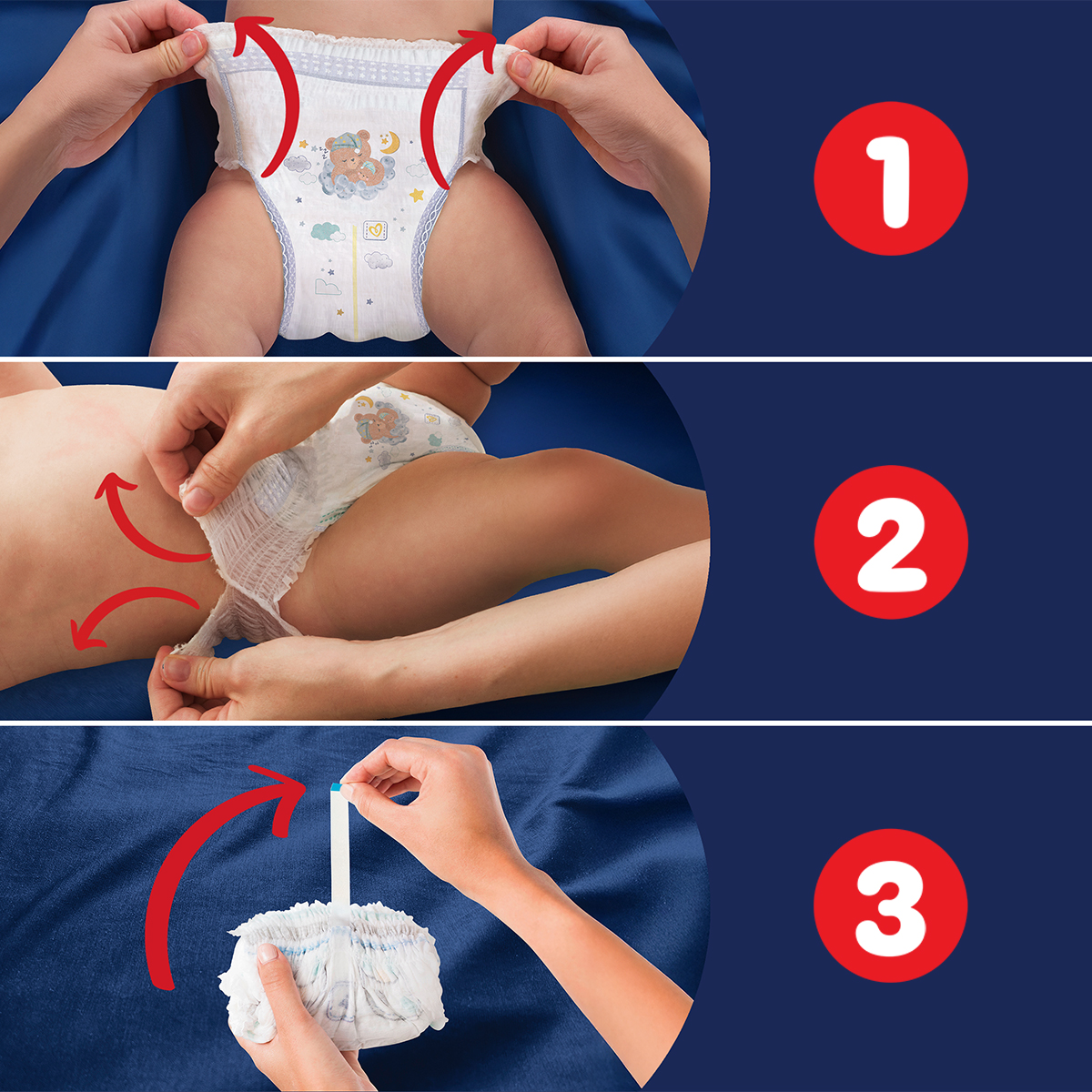 Podobnie jak wszystkie nasze pieluchomajtki, Pampers Night Pants łatwo się zmienia, nawet gdy dziecko się wierci: wystarczy jeden ruch, aby je założyć. Żeby zdjąć pieluchomajtki, musisz tylko rozedrzeć ich boczki, a przed wyrzuceniem zwinąć je i zabezpieczyć taśmą.