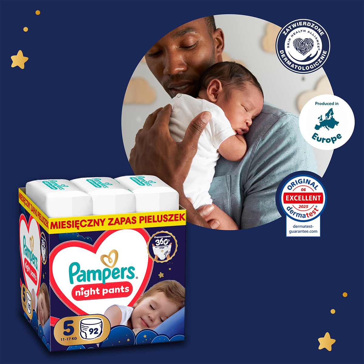 Marka Pampers, tak jak Ty, stawia na pierwszym miejscu dobro i bezpieczeństwo dziecka: Pieluchomajtki Pampers Night zostały przetestowane dermatologicznie i zatwierdzone przez dermatologów z organizacji Skin Health Alliance.