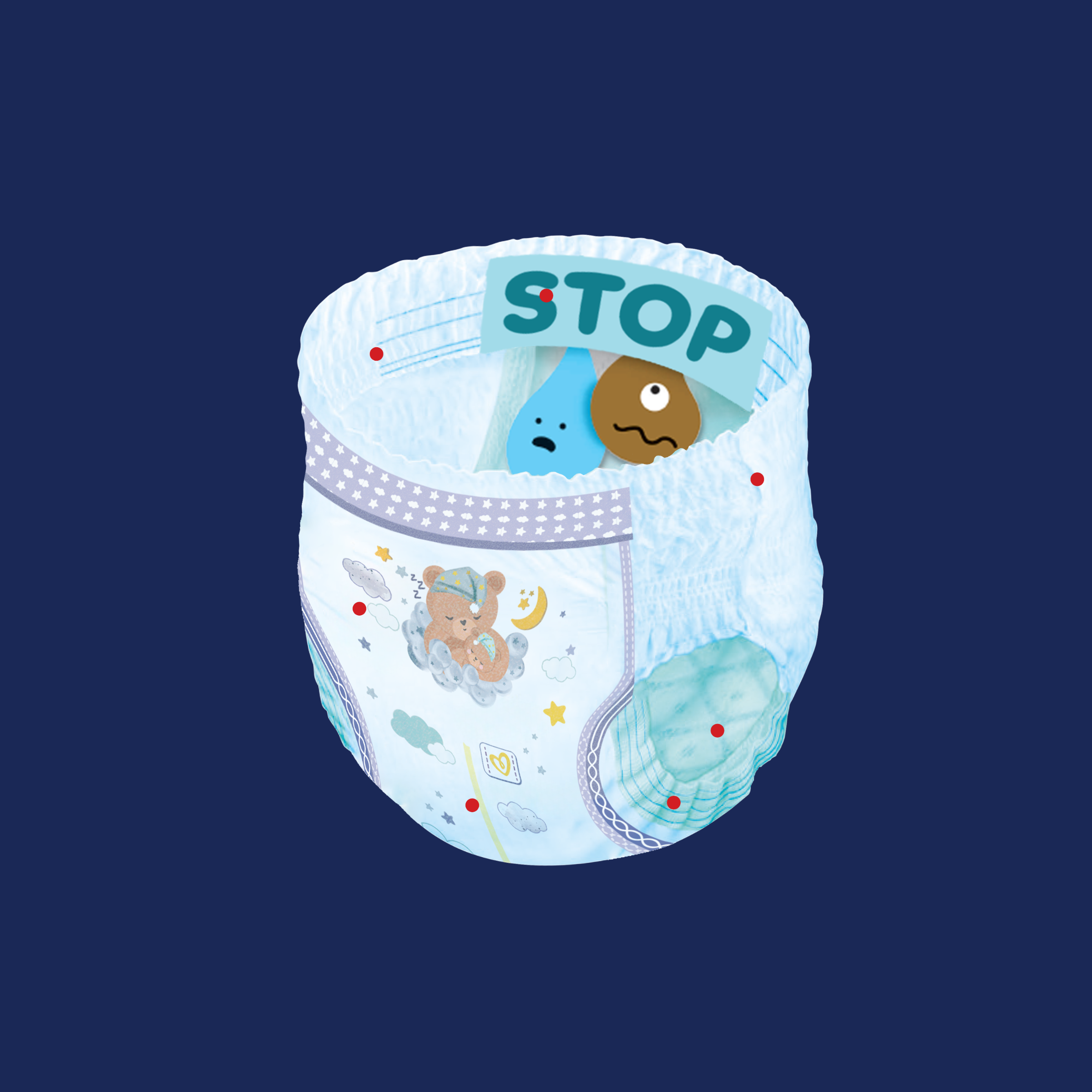 Zapewnij swojemu dziecku najlepszą ochronę w nocy dzięki pieluchomajtkom Pampers Night Pants z superchłonnym wkładem – to najbardziej chłonny model Pampers, który zapewnia nawet 100% ochrony przed przeciekaniem przez całą noc.