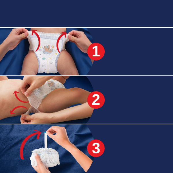 Podobnie jak wszystkie nasze pieluchomajtki, Pampers Night Pants łatwo się zmienia, nawet gdy dziecko się wierci: wystarczy jeden ruch, aby je założyć. Żeby zdjąć pieluchomajtki, musisz tylko rozedrzeć ich boczki, a przed wyrzuceniem zwinąć je i zabezpieczyć taśmą.