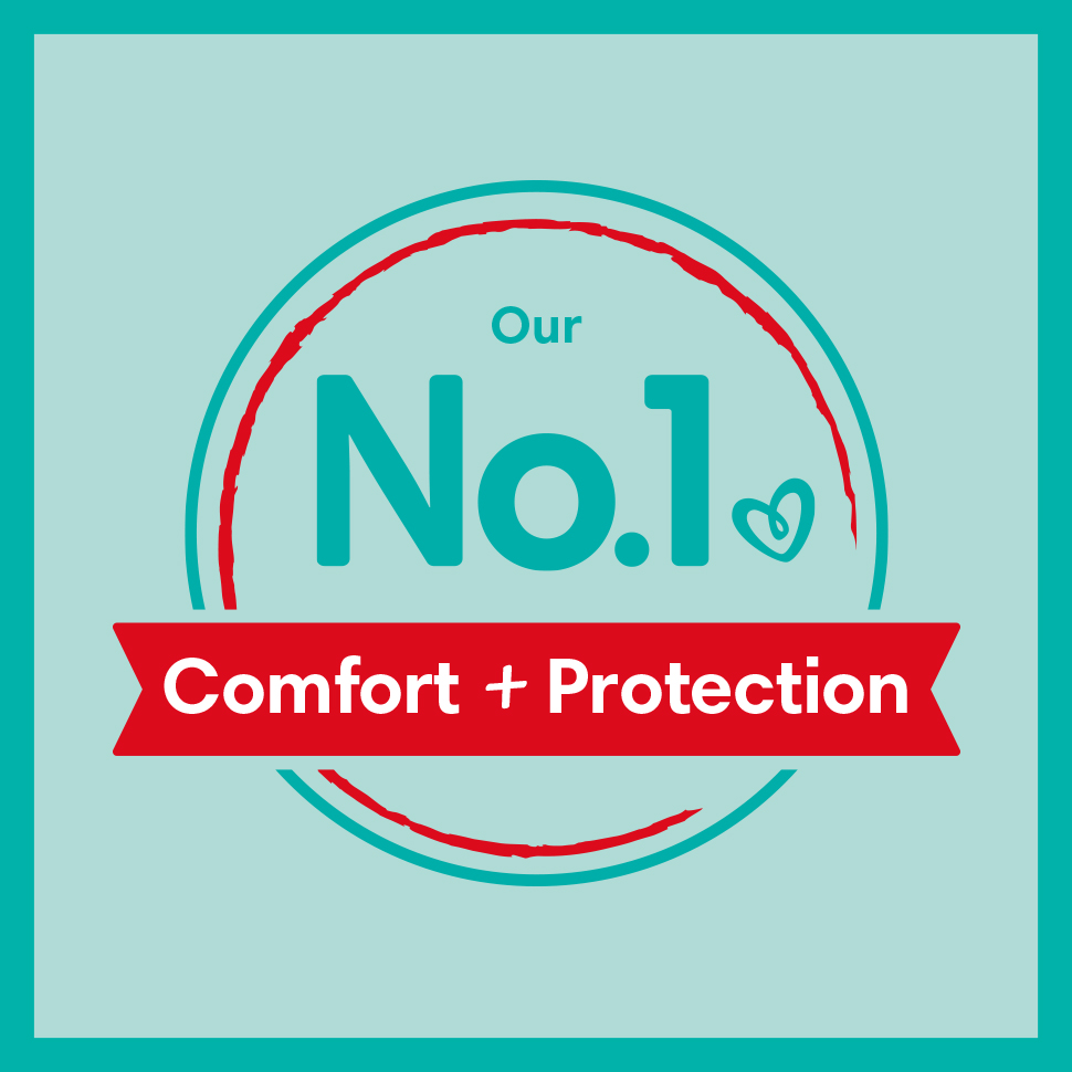 Zapewnij swojemu dziecku największy komfort i ochronę przed przeciekaniem od Pampers dzięki ultra-miękkiej elastycznej taśmie 360° zapewniającej pełne dopasowanie do ciała dziecka oraz kieszonce Stop & Protect, która zapewnia do 12 godzin pełnej ochrony i zapobiega przeciekaniu z tyłu.