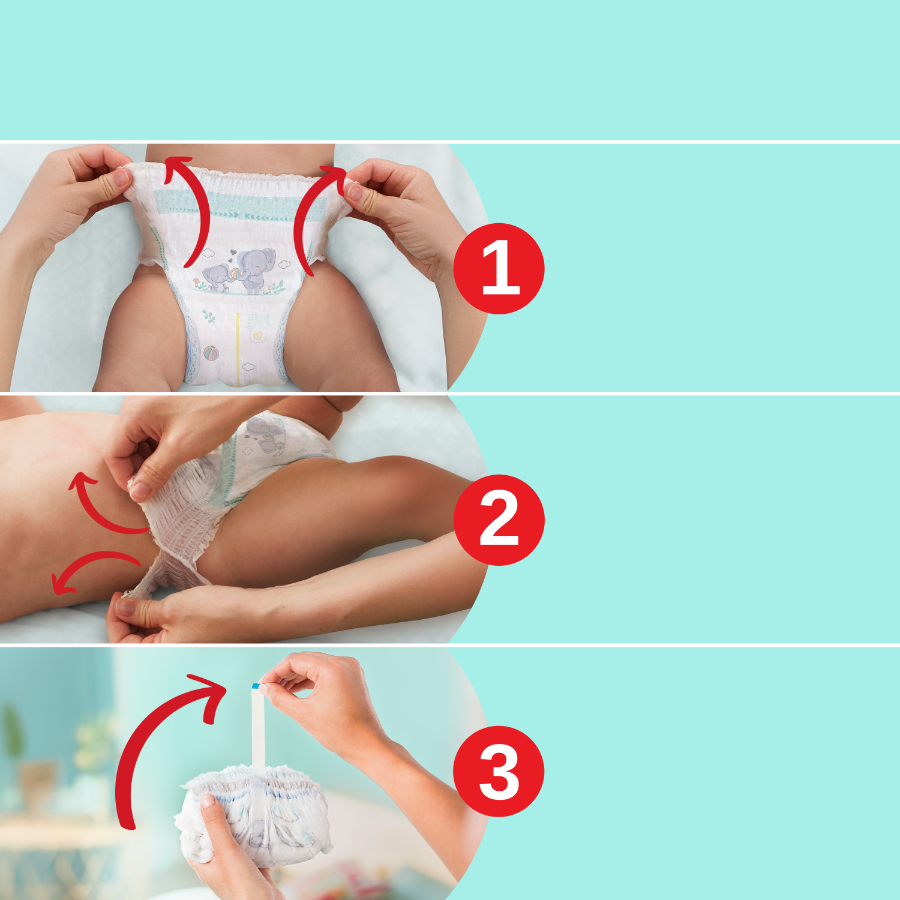 Podobnie jak wszystkie pieluchomajtki Pampers, Pampers Premium Care można łatwo zmienić, nawet gdy dziecko się wierci: wystarczy jeden ruch, aby je założyć. Żeby zdjąć pieluchomajtki, musisz tylko rozedrzeć ich boczki, a przed wyrzuceniem zwinąć je i zabezpieczyć taśmą.