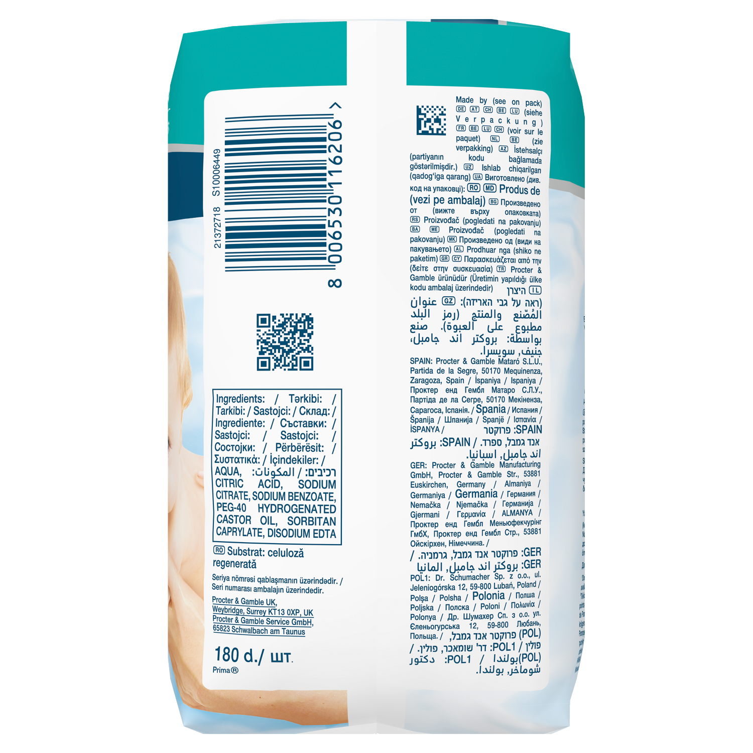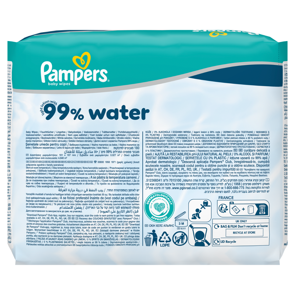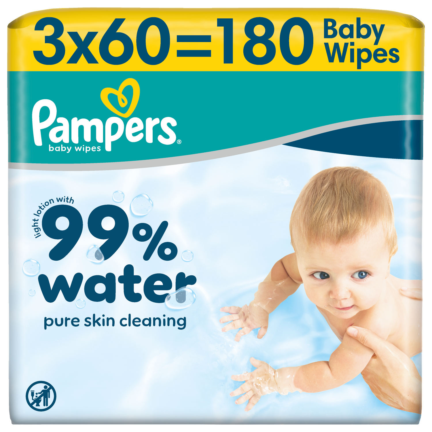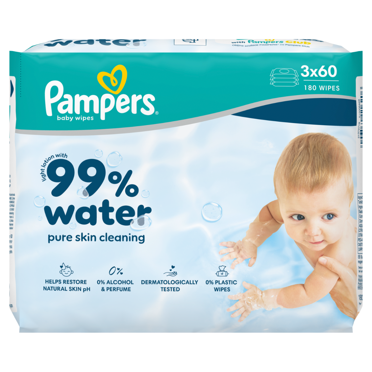 Pampers 99% Water – lekki balsam składający się w 99% z wody. Dzięki specjalnej formule, która pomaga przywrócić naturalne pH skóry i chronić ją przed zaczerwienieniem, nasze chusteczki zapewniają delikatne oczyszczanie i pomagają chronić delikatną skórę dziecka.