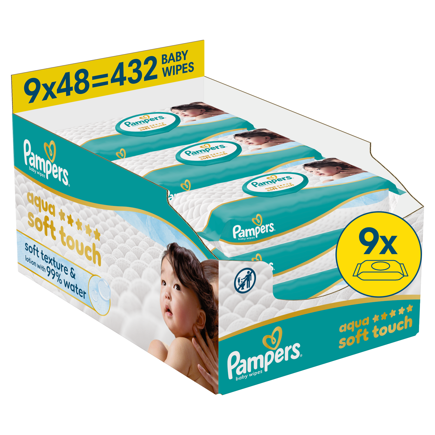 Pampers Aqua Soft Touch Chusteczki Nawilżane Dla Dzieci, 9 Opakowań po 48 Chusteczek = 432 sztuki