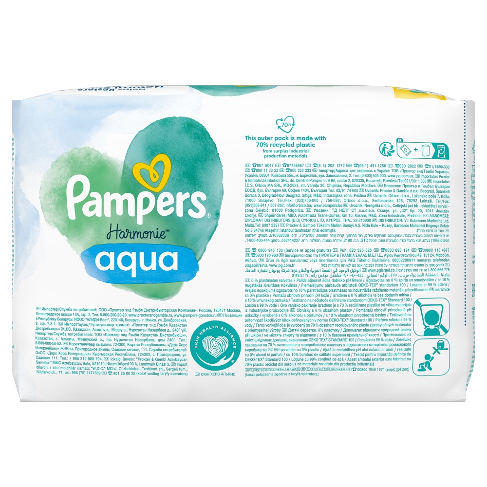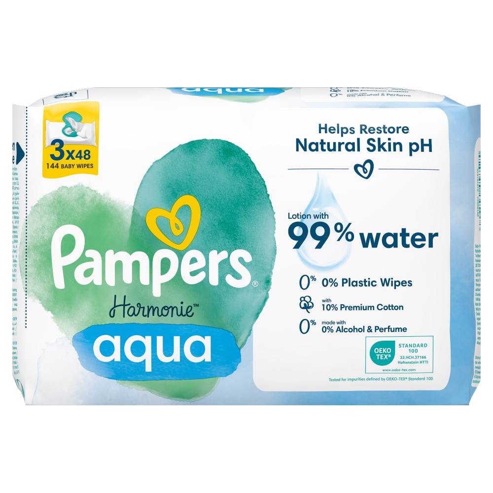 Delikatny balsam składający się w 99% z czystej wody. Chusteczki nawilżane Pampers Harmonie Aqua są bardziej delikatne niż sama bawełna i woda. Dzięki unikalnej formule delikatne środki chroniące i oczyszczające skórę pomagają przywrócić naturalne pH skóry, chroniąc ją przed podrażnieniami. Nie zwierają alkoholu ani substancji zapachowych. Ich formuła została przebadana dermatologicznie. Zostały one zatwierdzone przez dermatologów z organizacji Skin Health Alliance i przebadane zgodnie ze standardem OEKO-TEX 100.