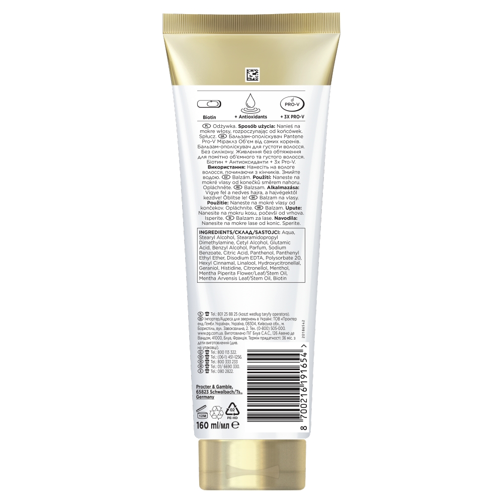 Innowacyjna formuła pogrubiającej włosy odżywki Pantene, wzbogacona biotyną, przeciwutleniaczami i najwyższym stężeniem Pro-V, wzmacnia cienkie i płaskie włosy, narażone na uszkodzenia po stylizacji. Dzięki temu stają się one wyraźnie grubsze i pełniejsze już po 1. użyciu. Nie zawiera silikonu i ma 3 razy więcej PRO-V w porównaniu do szamponu Pantene Repair and Protect. Aby uzyskać najlepszy efekt, stosuj codziennie w połączeniu z innymi produktami z linii Lift&Volume – szamponem, odżywką i olejkiem.