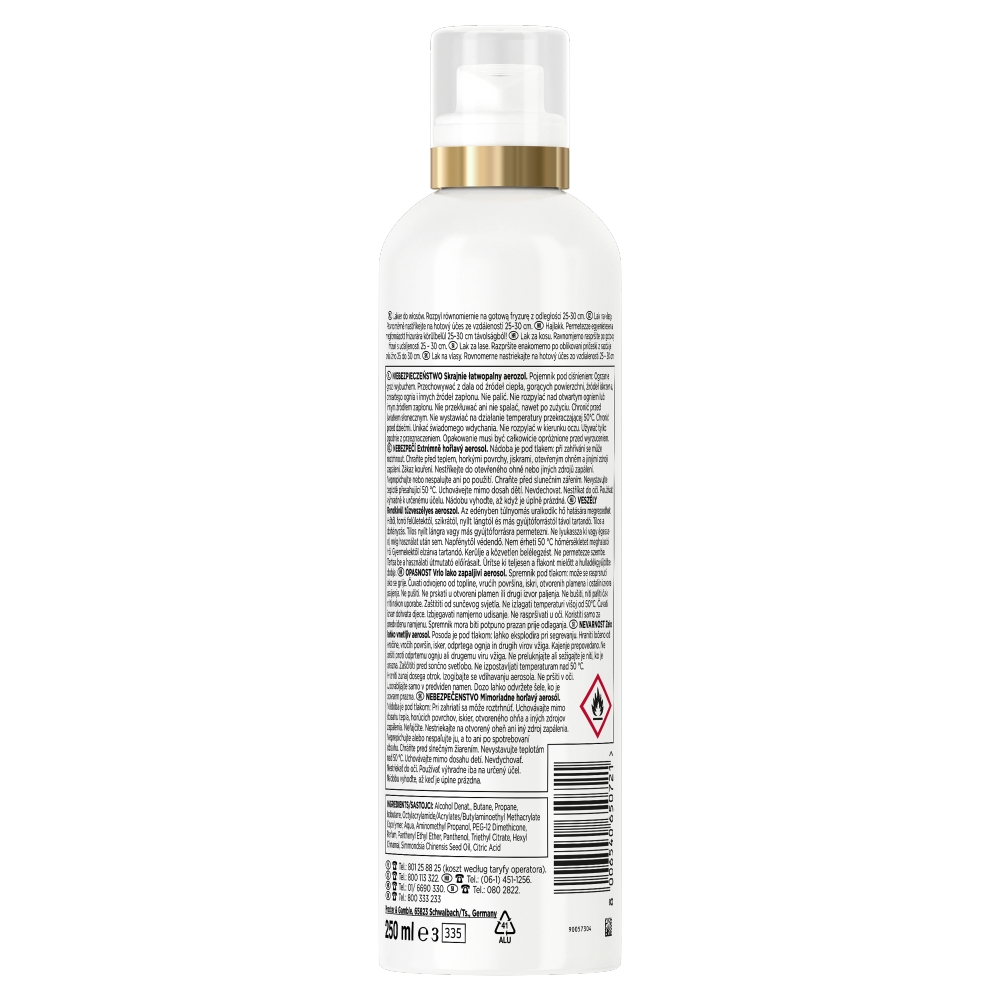 Rozpyl równomiernie na gotową fryzurę z odległości 25-30 cm.