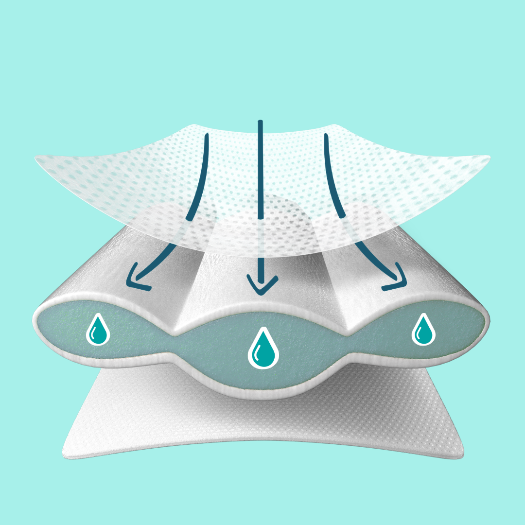 Podwójna ochrona: NATYCHMIASTOWE WCHŁANIANIE wilgoci chroni skórę, a KIESZONKA STOP & PROTECT zapobiega przeciekaniu