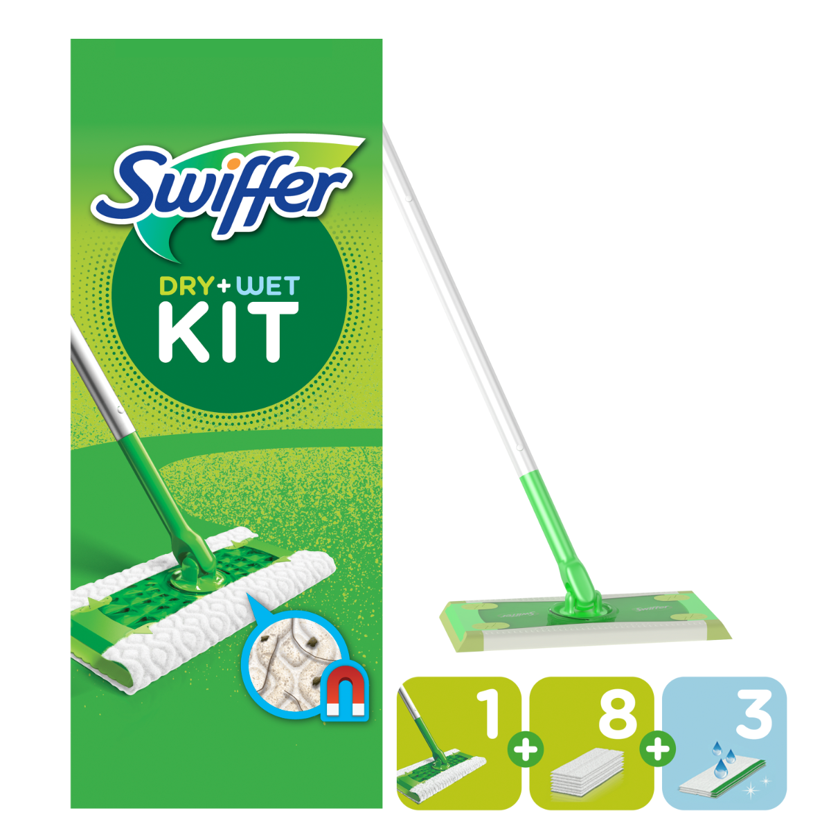 Swiffer Dry+Wet Kit Zestaw: mop, 8 suchych i 3 mokre chusteczki do kurzu