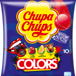 10 lizaków Chupa Chups barwiących język w 3 smakach: wiśniowym, pomarańczowym i coli w torebce.