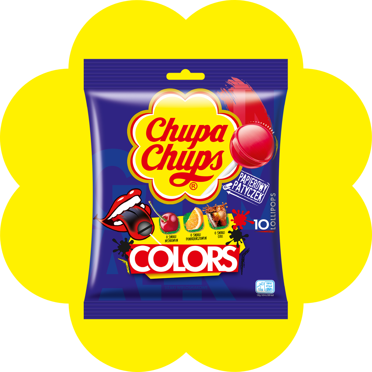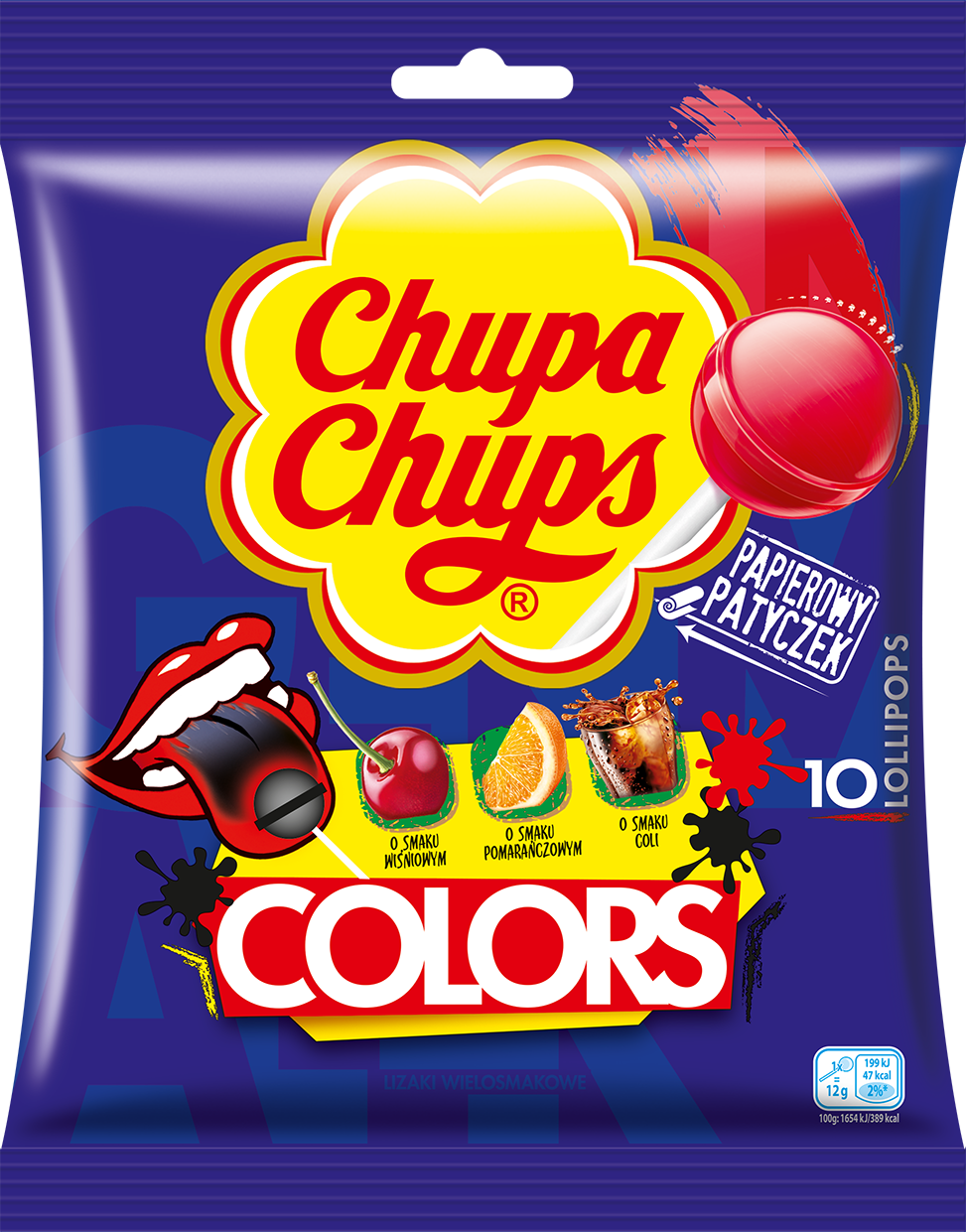 10 lizaków Chupa Chups barwiących język w 3 smakach: wiśniowym, pomarańczowym i coli w torebce.
