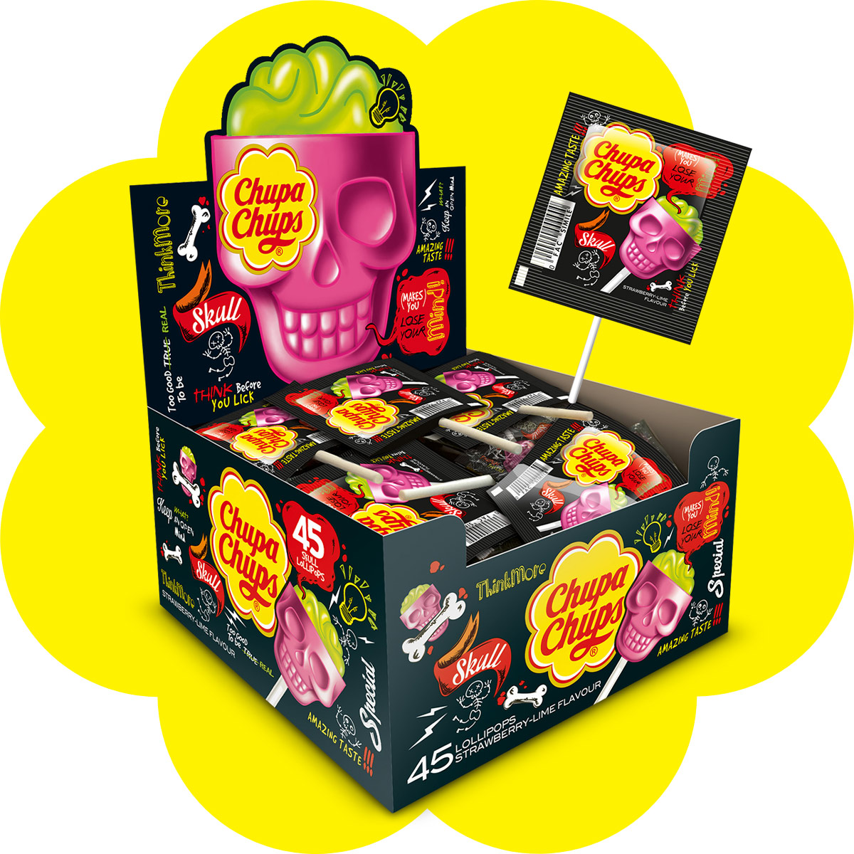 Lizaki Chupa Chups w kształcie czaszki to strasznie smaczna przekąska. Przekonaj się i poznaj połączenie truskawki i limonki z pyszną musującą pianką. Od teraz dostępne w opakowaniu 45 szt, tak aby wystarczyło ich dla wszystkich!