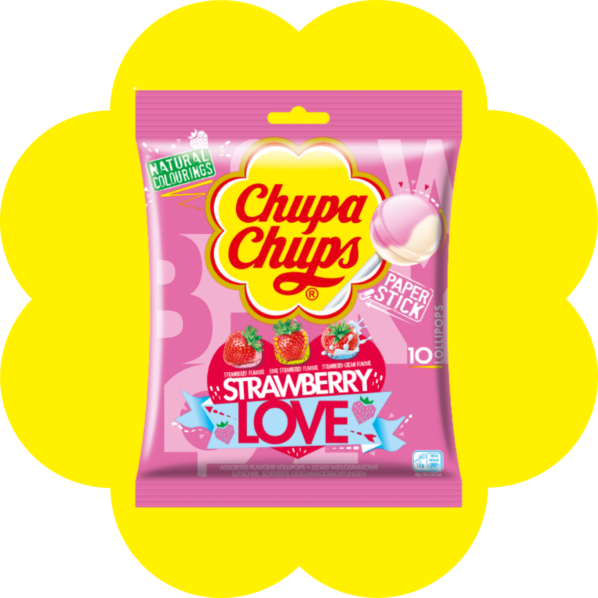 Chupa Chups Strawberry Love to 10 lizaków w trzech wyśmienitych opcjach smakowych: słodka truskawka, kwaśna truskawka i truskawka ze śmietanką.