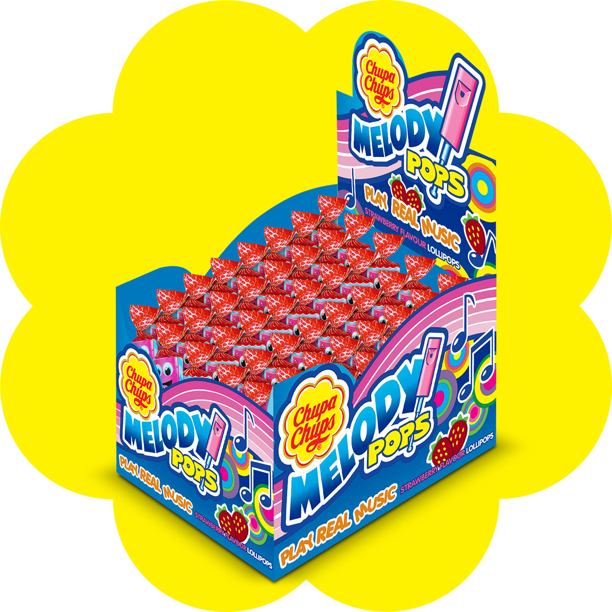 Lizaki Chupa Chups Melody Pops 15g o smaki soczystej truskawki to wesoła zabawa dla Ciebie i Twojego dziecka. Niech świat usłyszy melodie wygrywane na naszym lizaku-gwizdku – Melody Pops! Od teraz dostępne w opakowaniu 48 szt, tak abyście zagrali niezłą piosenkę!