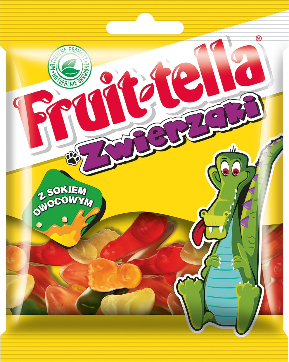 Żelki Fruittella to owocowe żelki w kształcie sympatycznych zwierzaków! Żelki zawierają soki owocowe, a dodatkowo każdy zwierzak ma białą „podeszwę” piankę. Produkt naturalnie barwiony, zawierający naturalne aromaty.