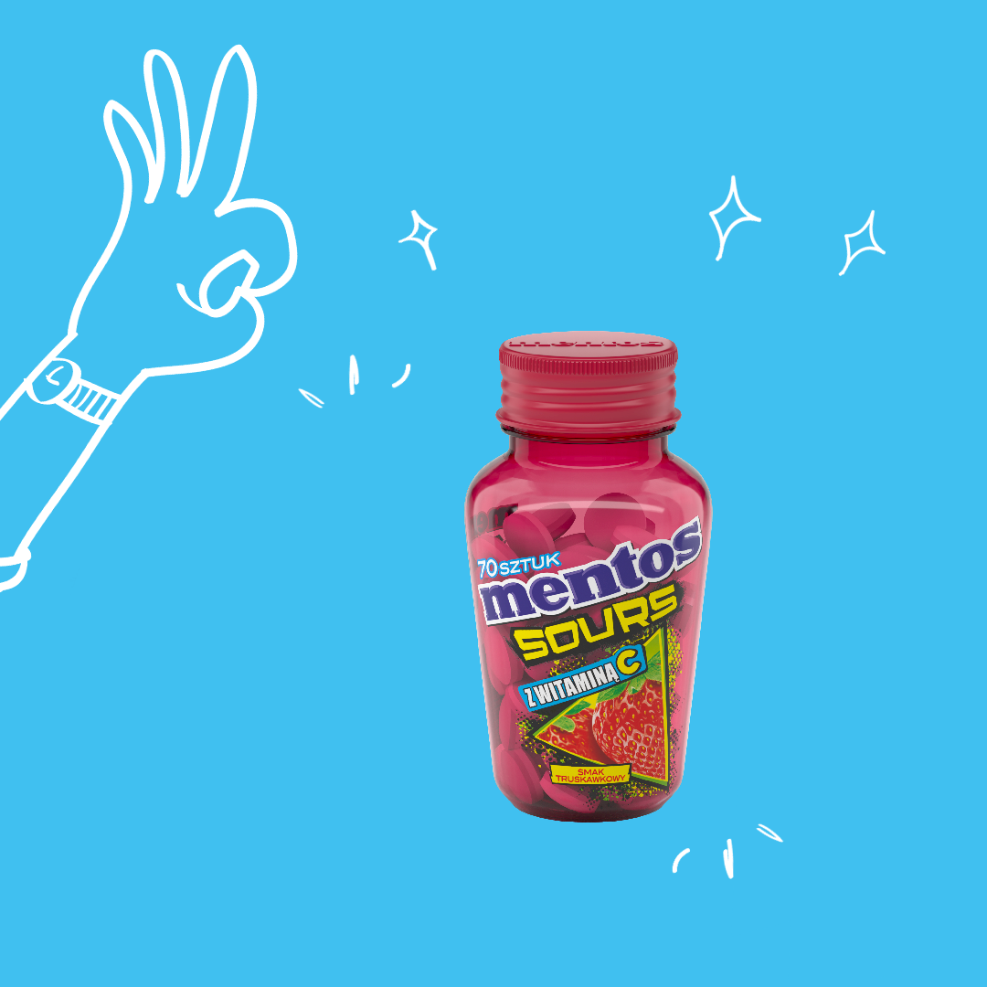 Wypróbuj unikalnej nowości od marki MENTOS. Kwaśne pastylki bez cukru o smaku truskawki wzbogacone o witaminę C. Aż 70 cukierków w jednej wyjątkowej butelce.