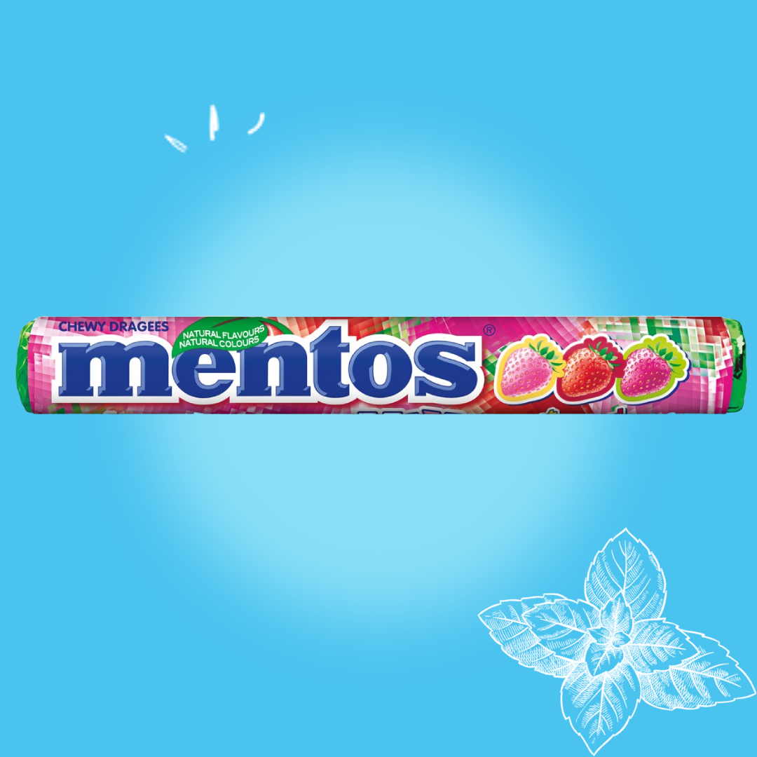 Mentos Strawberry Mix to mieszanka kwaśnej, klasycznej i słodkiej truskawki. Unikalne połączenie trzech smaków soczystej truskawki w jednej rolce cukierków do żucia Mentos.