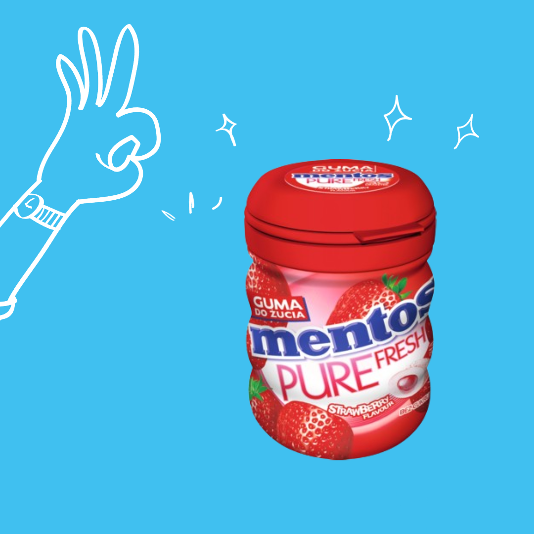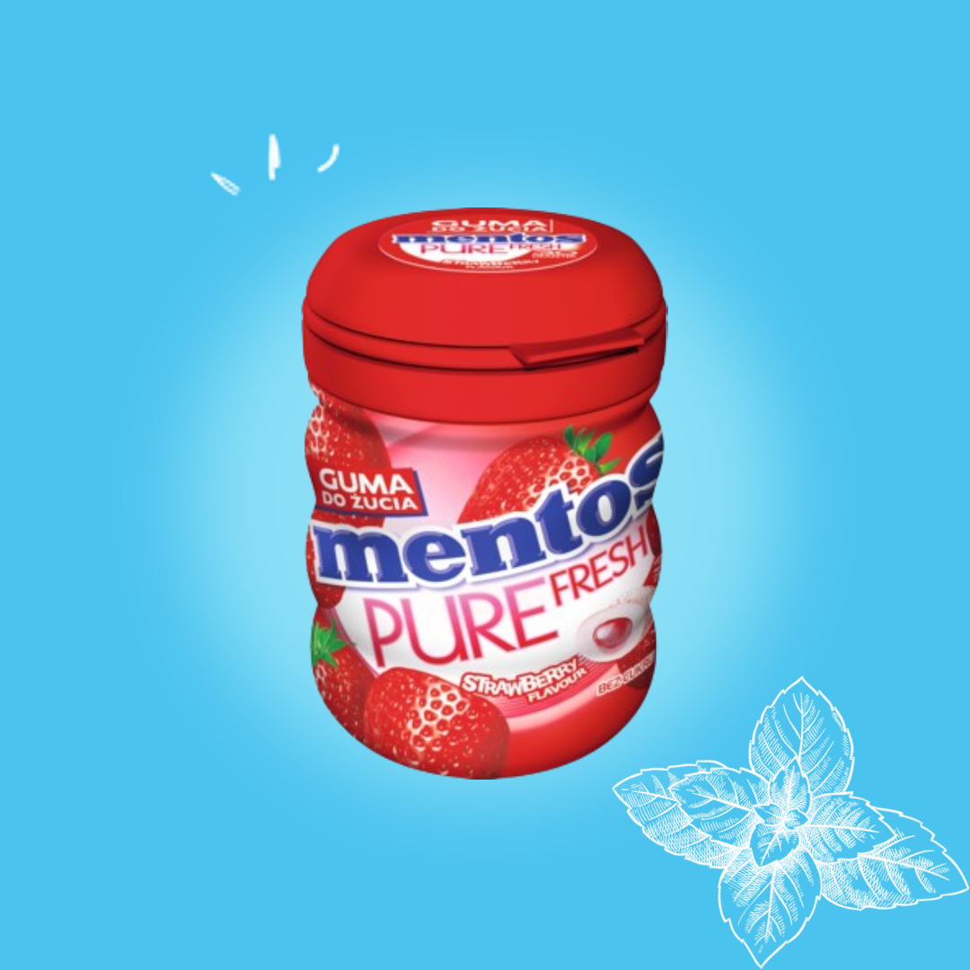 Mentos Pure Fresh Truskawka – Guma do żucia bez cukru o smaku soczystej truskawki. Płynna esencja da Ci natychmiastowe odświeżenie na długo!