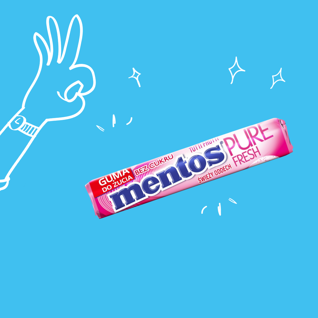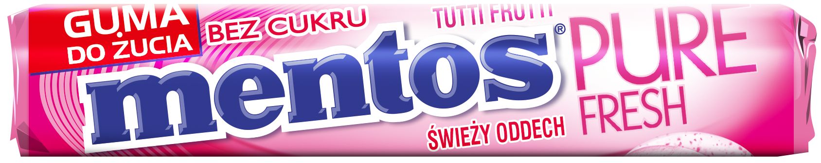 Mentos Pure Fresh Tutti Frutti – gumy do żucia z płynną esencją gwarantującą natychmiastowe odświeżenie na długo! wyjątkowe połączenie owoców i mięty. teraz w nowym kieszonkowym opakowaniu.