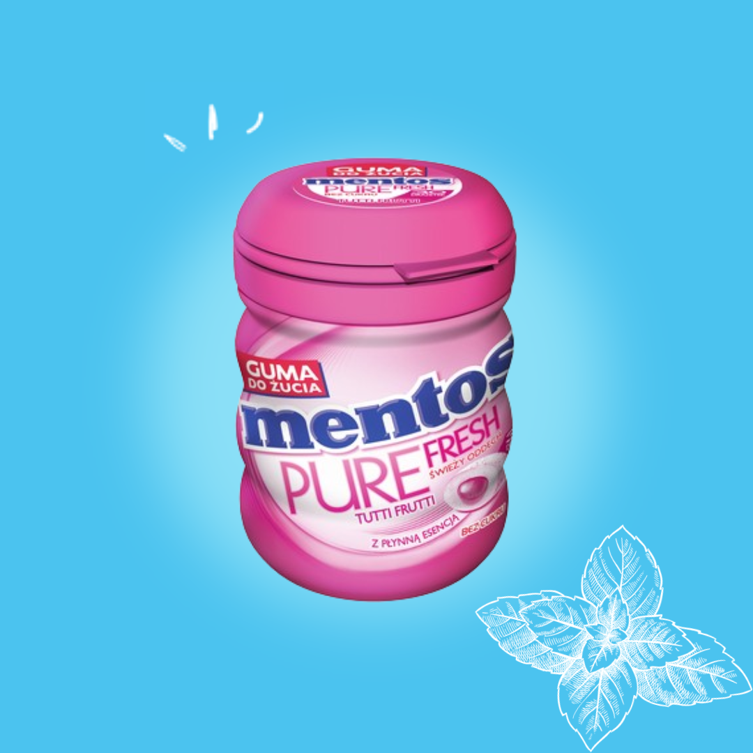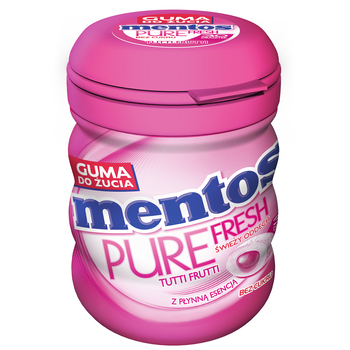 Mentos Pure Fresh Tutti Frutti – Guma do żucia bez cukru z płynną esencją gwarantującą natychmiastowe odświeżenie na długo! Wyjątkowe połączeniu owoców i mięty.