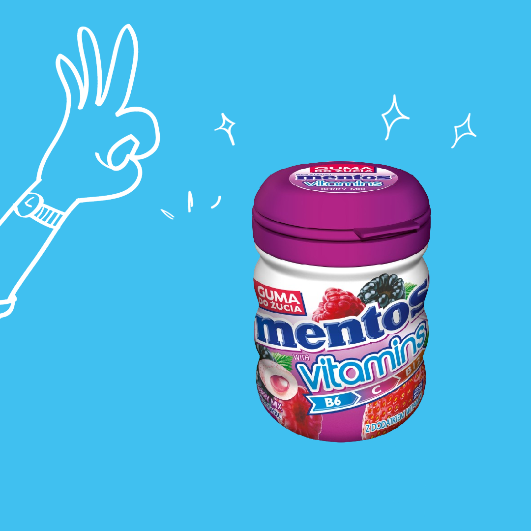 Świeży dzień z Gumą Mentos z Witaminami! Każdy kawałek tej bezcukrowej gumy o smaku jagodowym zawiera 30% dziennego zapotrzebowania na witaminy B6, B12 i C, dając podmuch smaku jagodowego. Guma Mentos z witaminami jest dostępna w wygodnej butelce, idealnej do trzymania przy biurku, w samochodzie, w domu lub gdziekolwiek chcesz trochę świeżości! Dzięki 25 drażetkom w butelce możesz dzielić się z innymi lub zachować całą świeżość dla siebie.