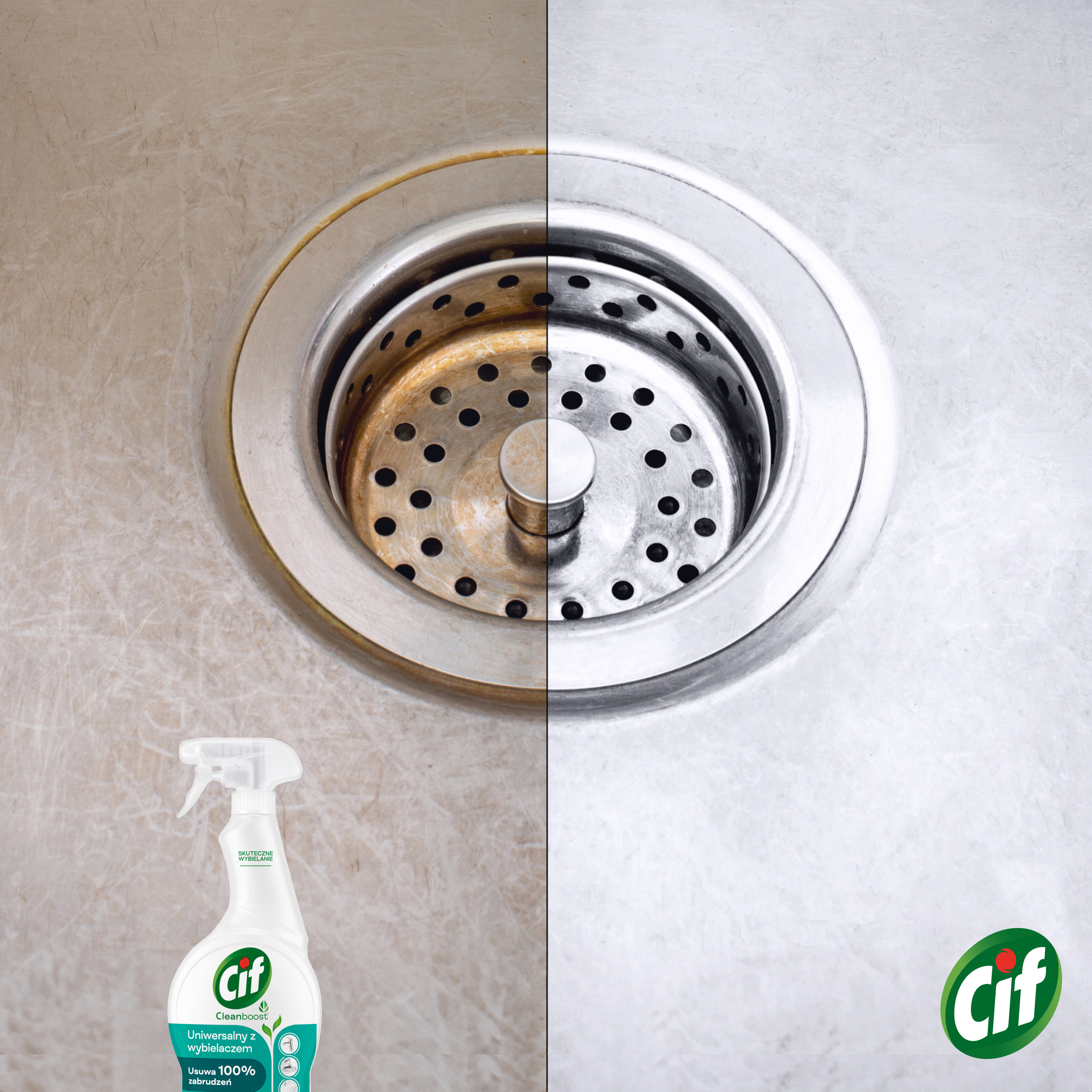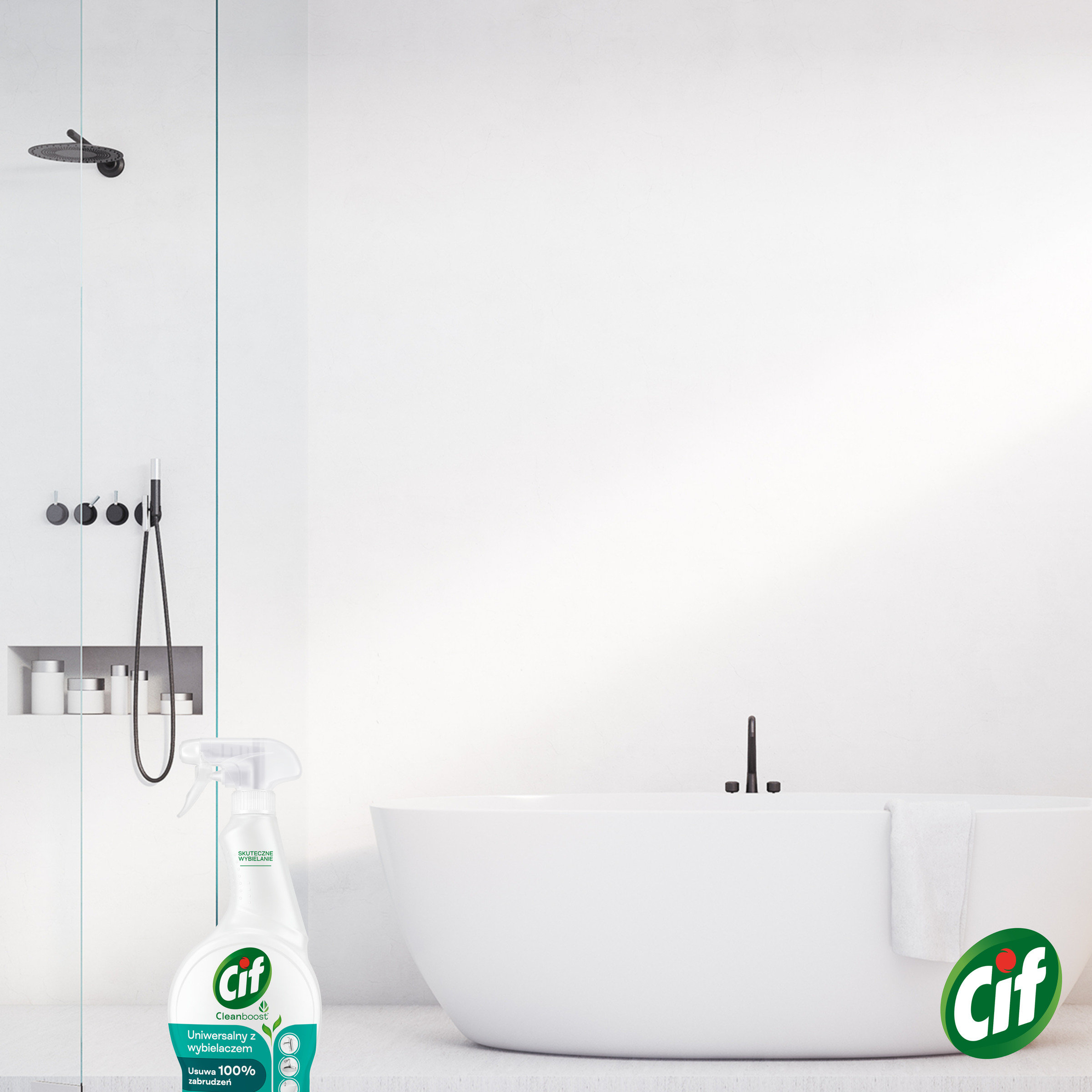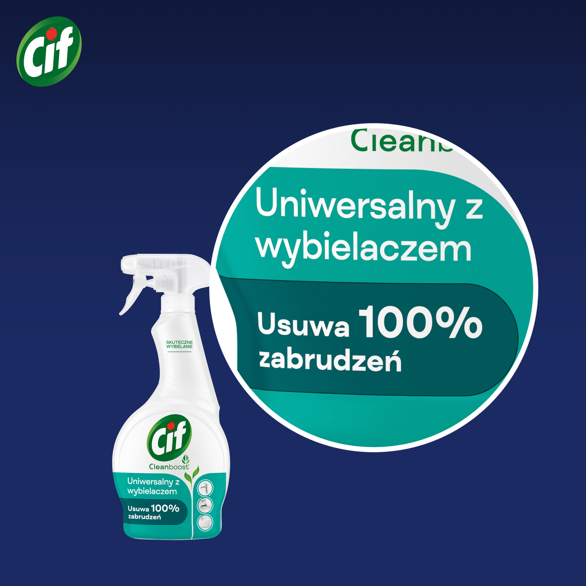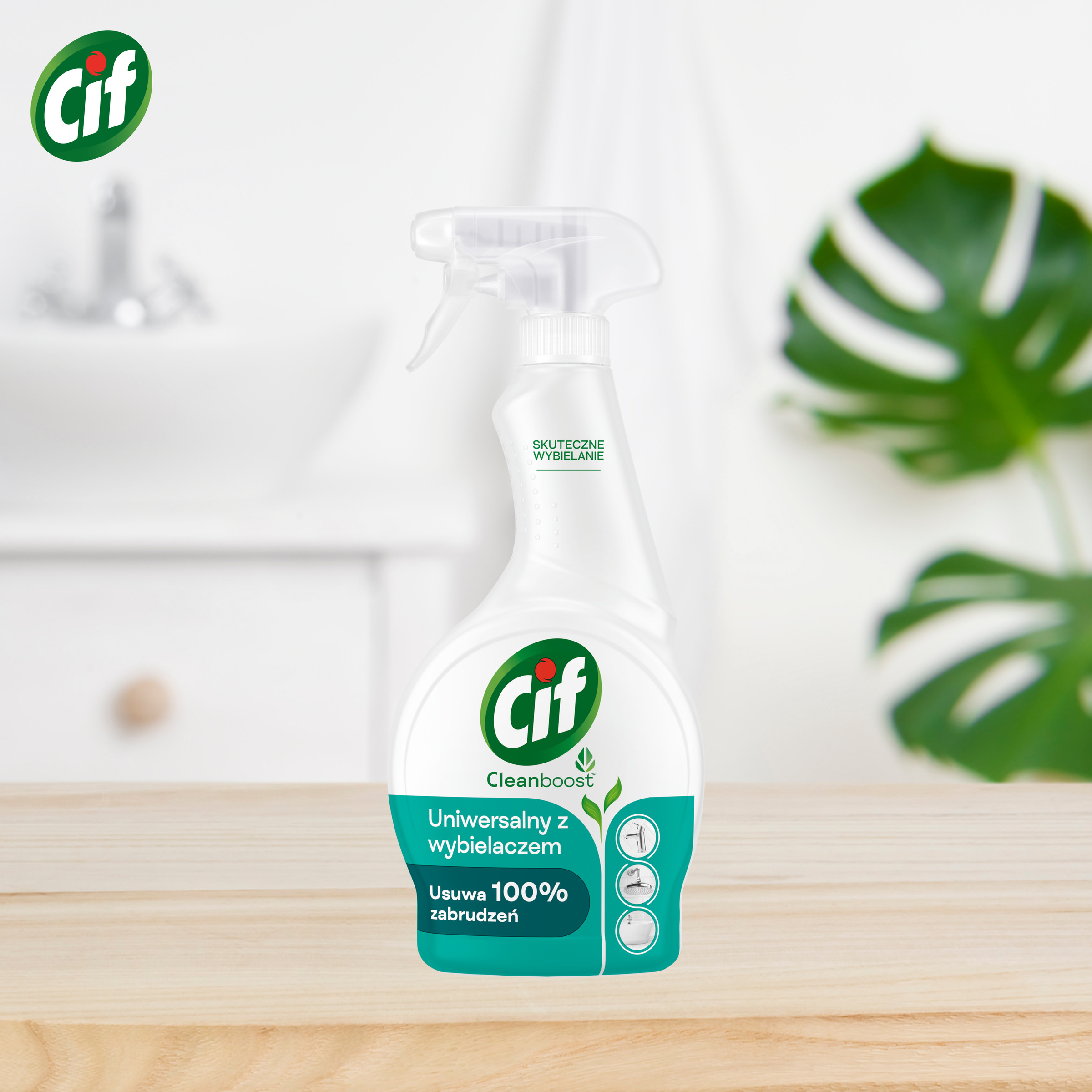 Spray Cif Cleanboost Uniwersalny z wybielaczem to 100% skuteczności w walce z brudem i osadem.