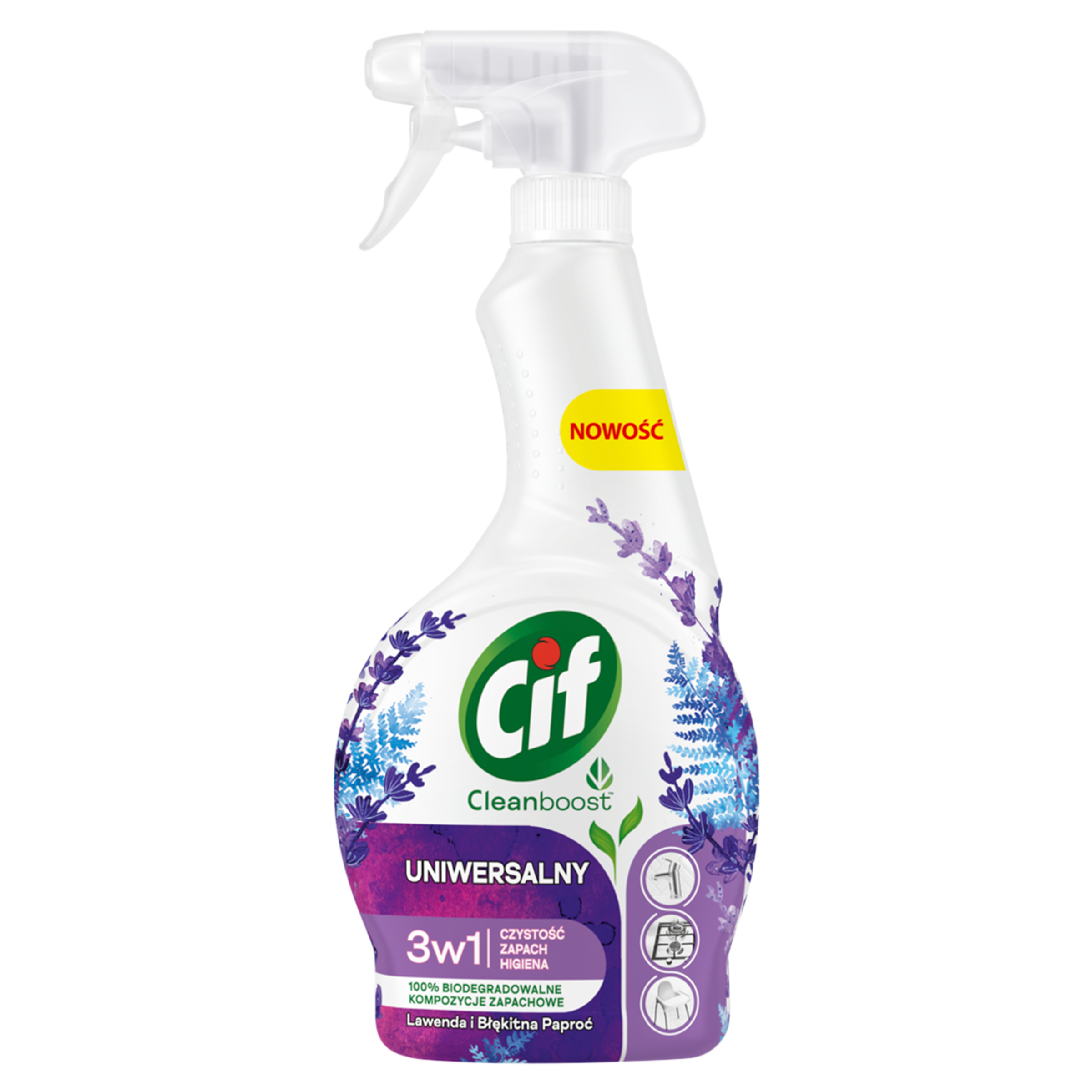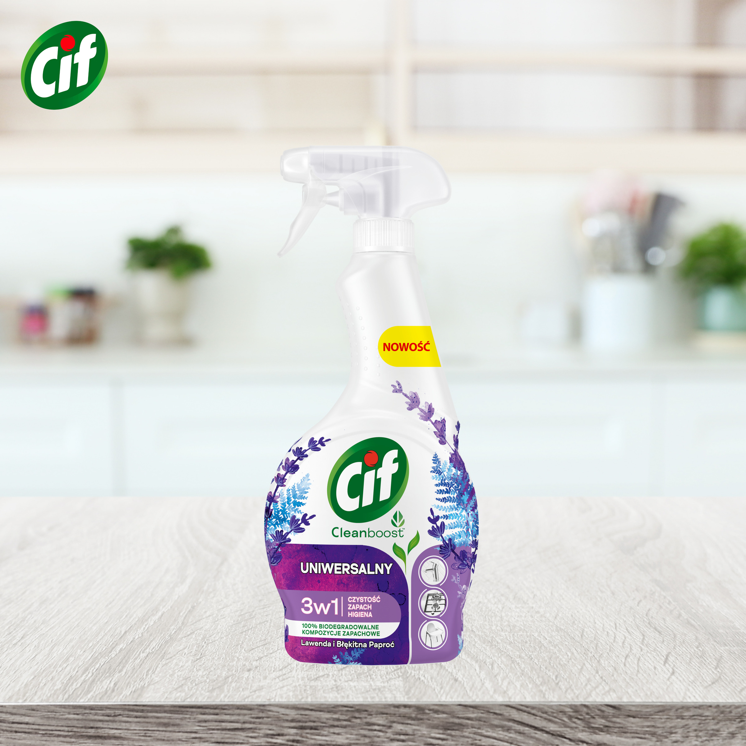 Spray Cif Cleanboost 3w1 nie tylko zapewni czystość, ale pozostawi też przyjemną, świeżą woń lawendy i błękitnej paproci.