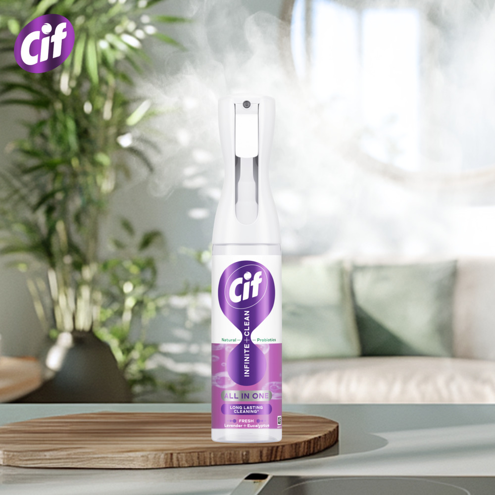 Formuła sprayu Cif Infinite Clean z naturalnymi probiotykami zapewni w Twoim domu długotrwałą czystość z efektem działania nawet do 3 dni*.