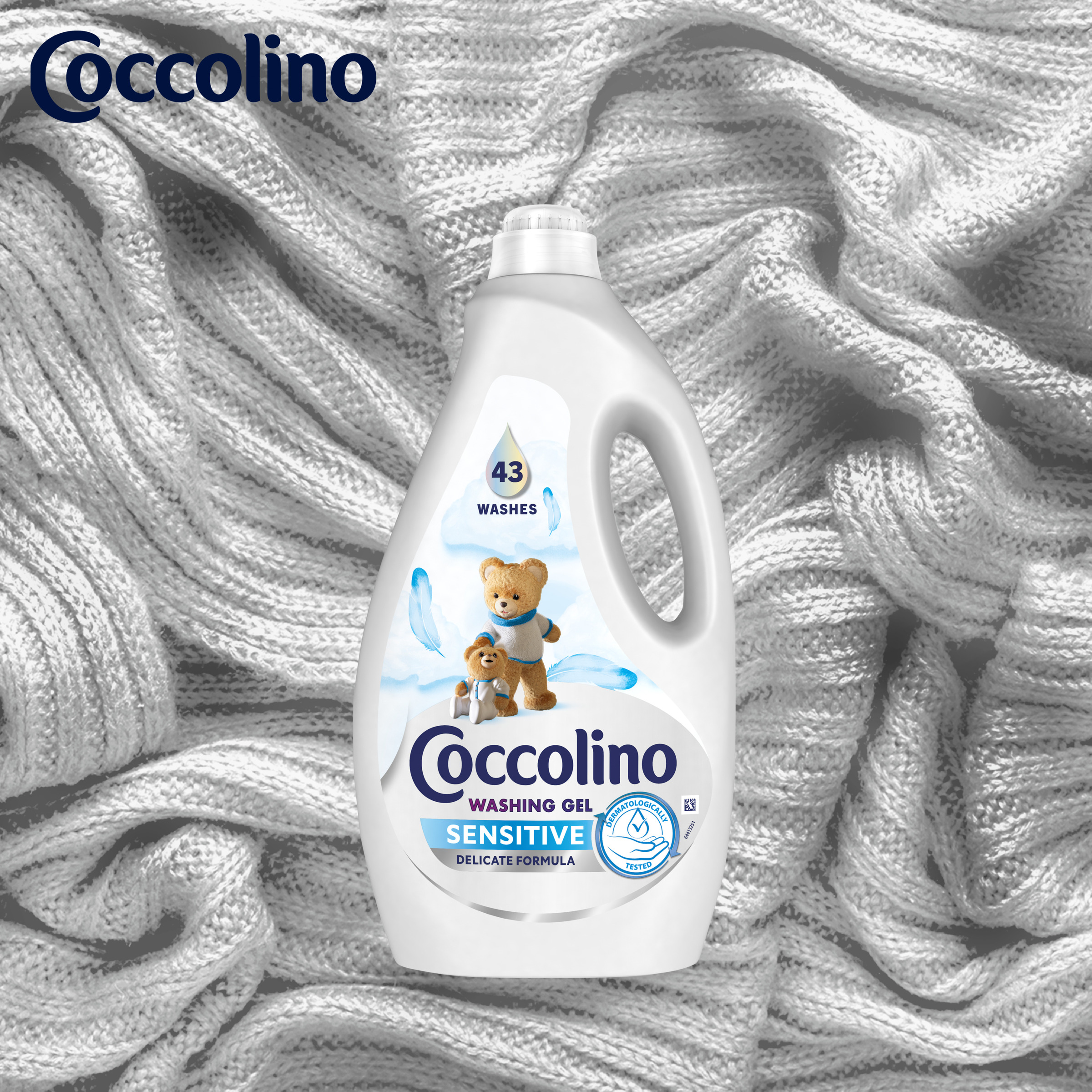 Coccolino Sensitive Żel pomaga zachować kształt ubrań, a specjalna formuła dba o kolor tkanin.