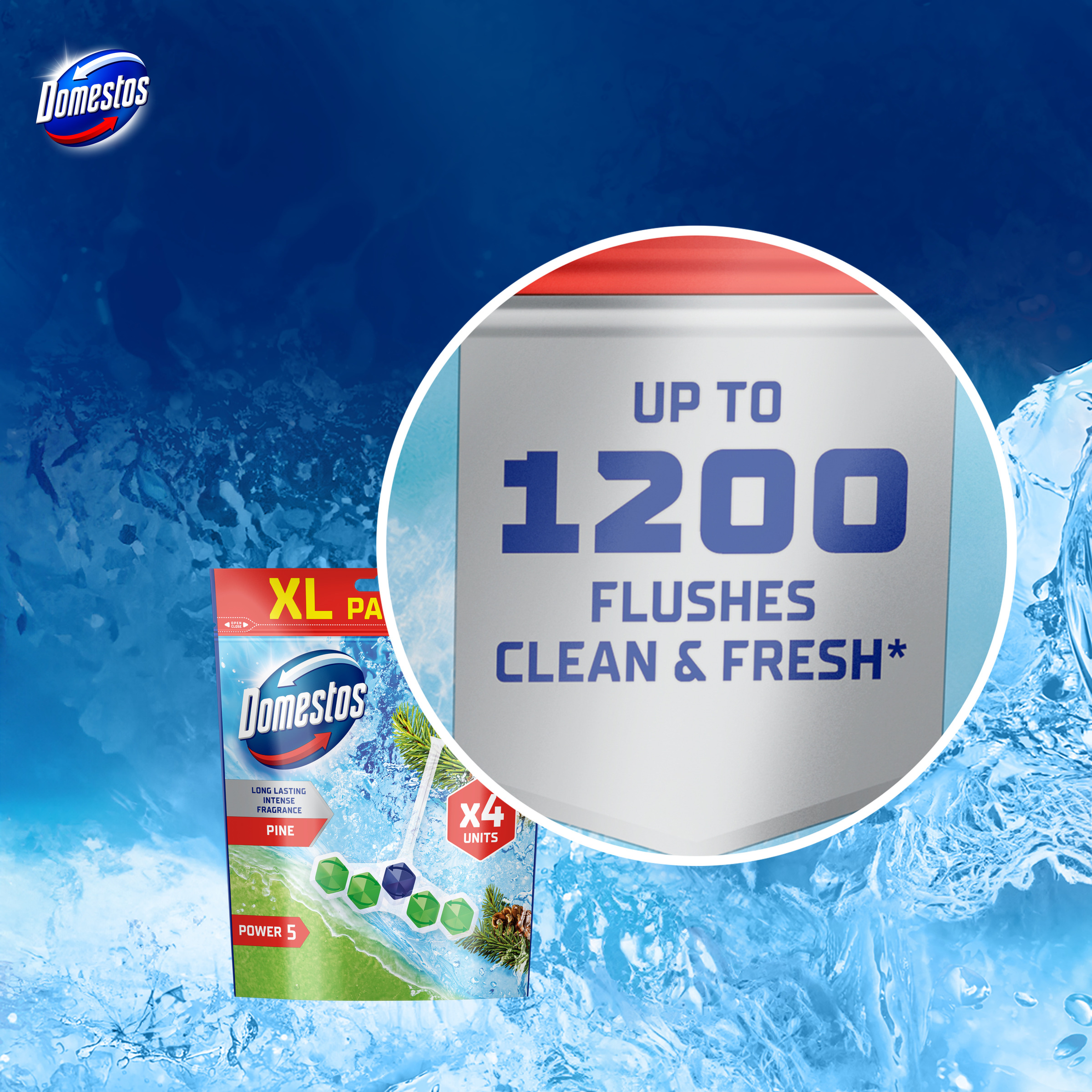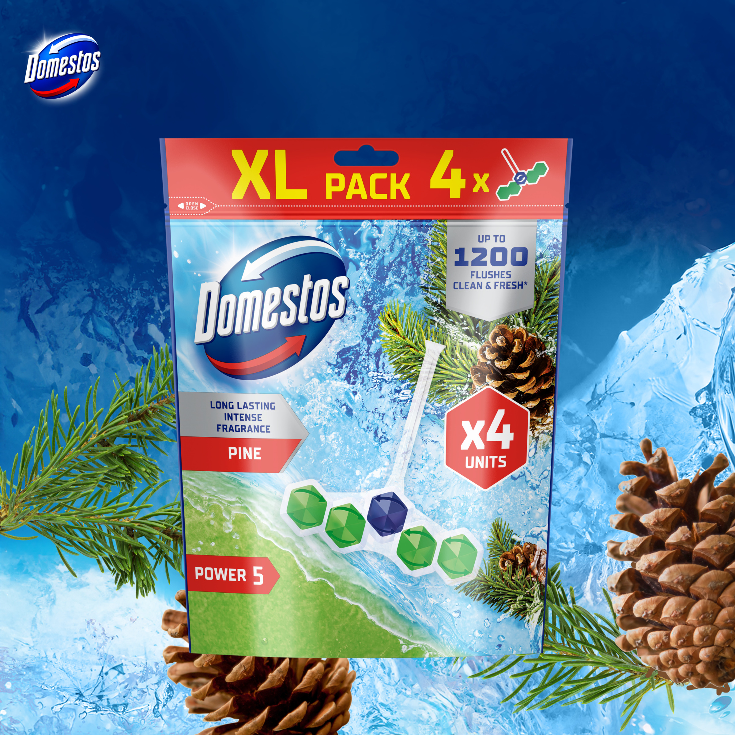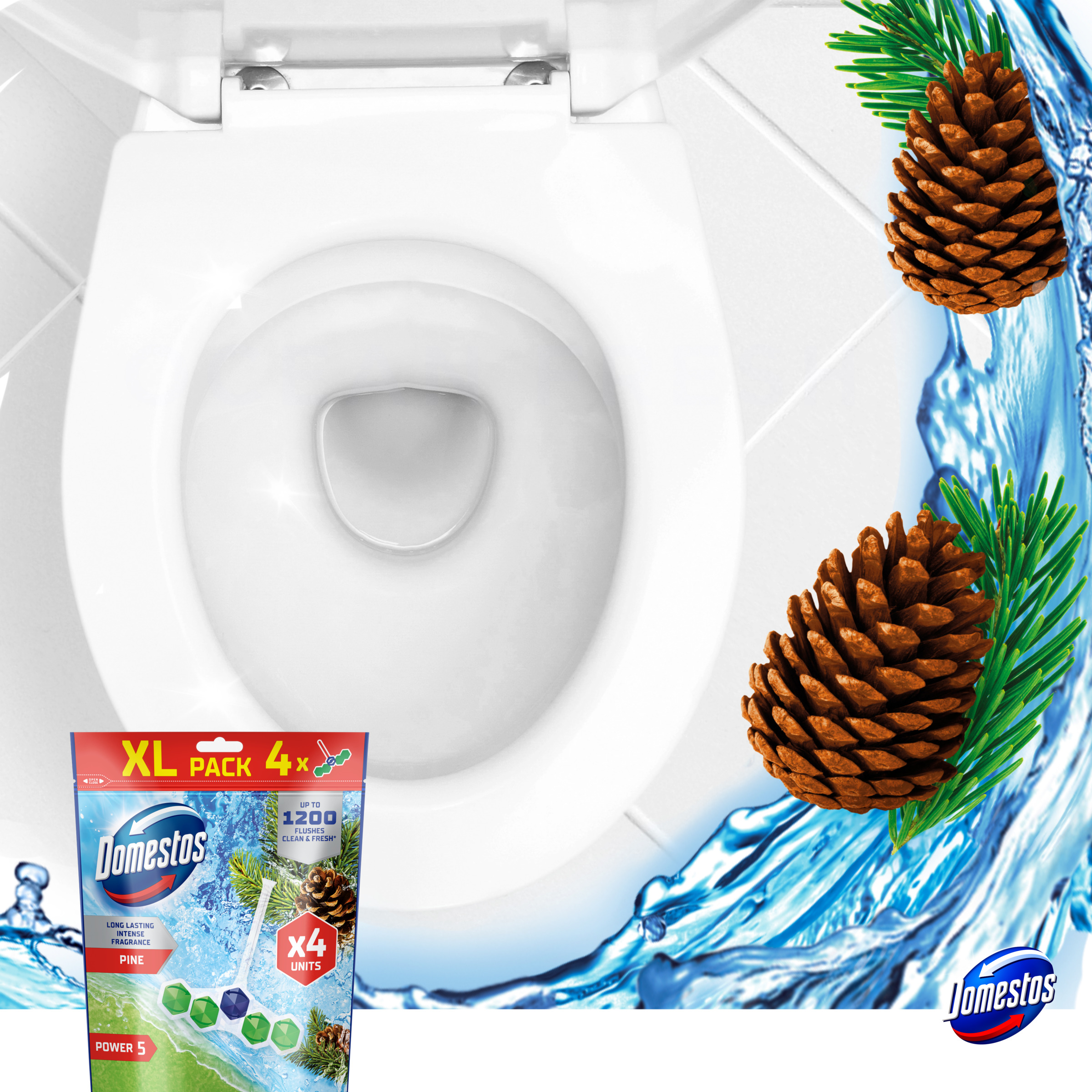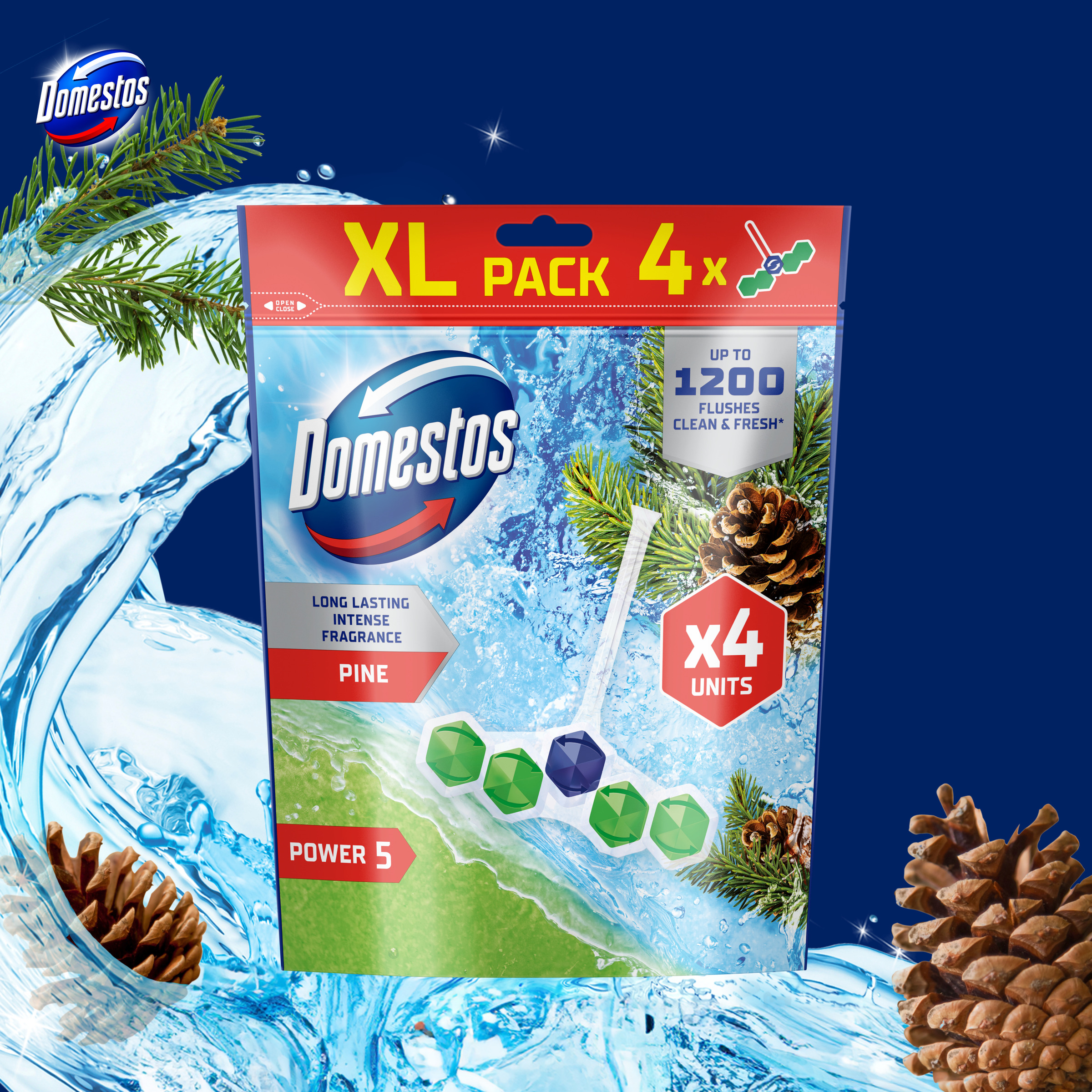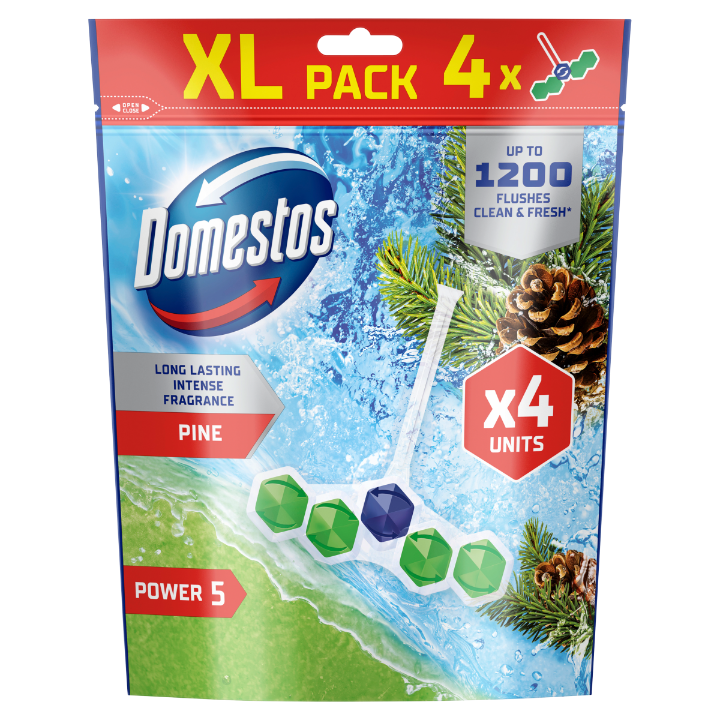 Kostki toaletowe Domestos Power 5 Pine 4 x 50g zapewniają higieniczną czystość i długotrwałą świeżość w toalecie aż do 1200 spłukań –* każda z czterech zawieszek gwarantuje do 300 użyć.