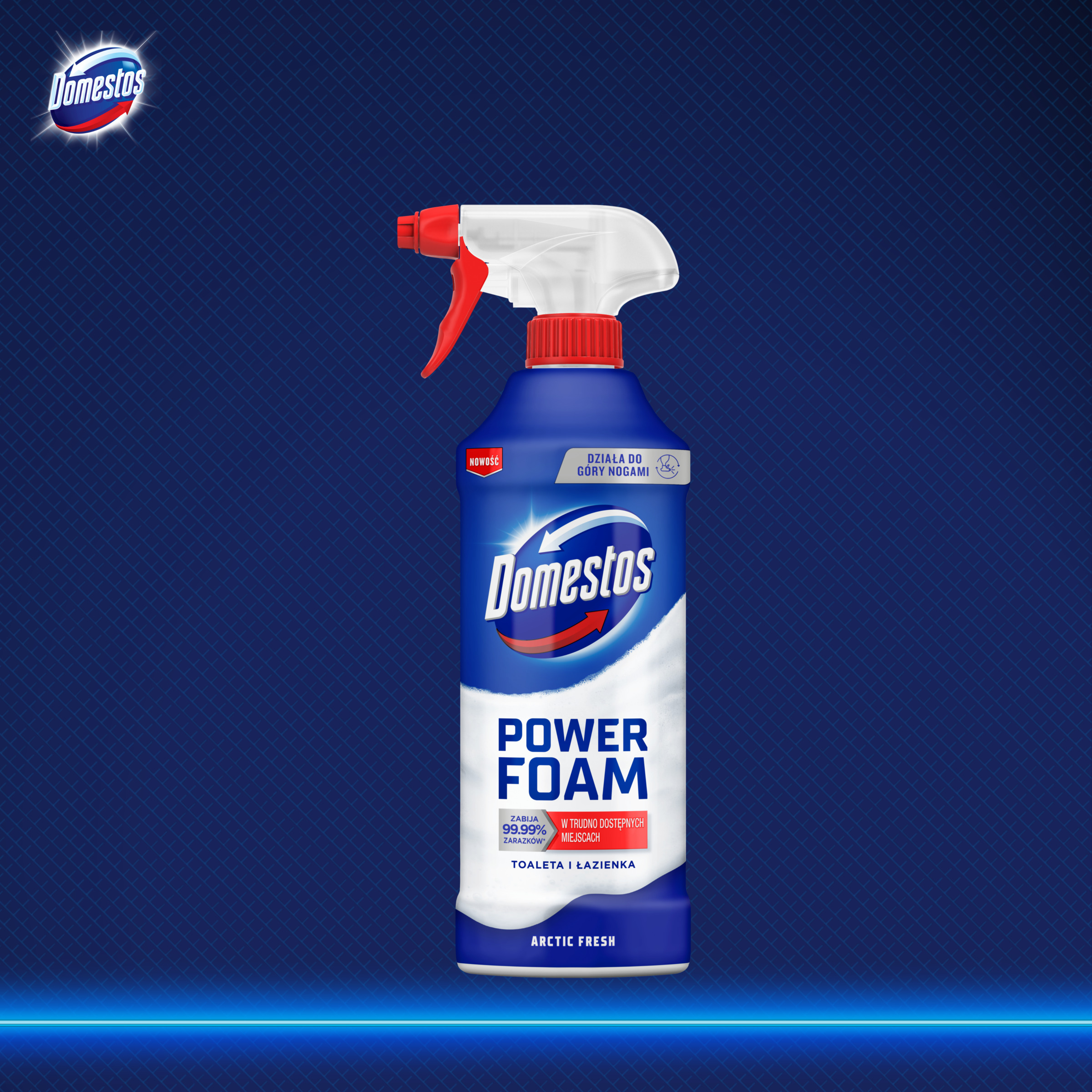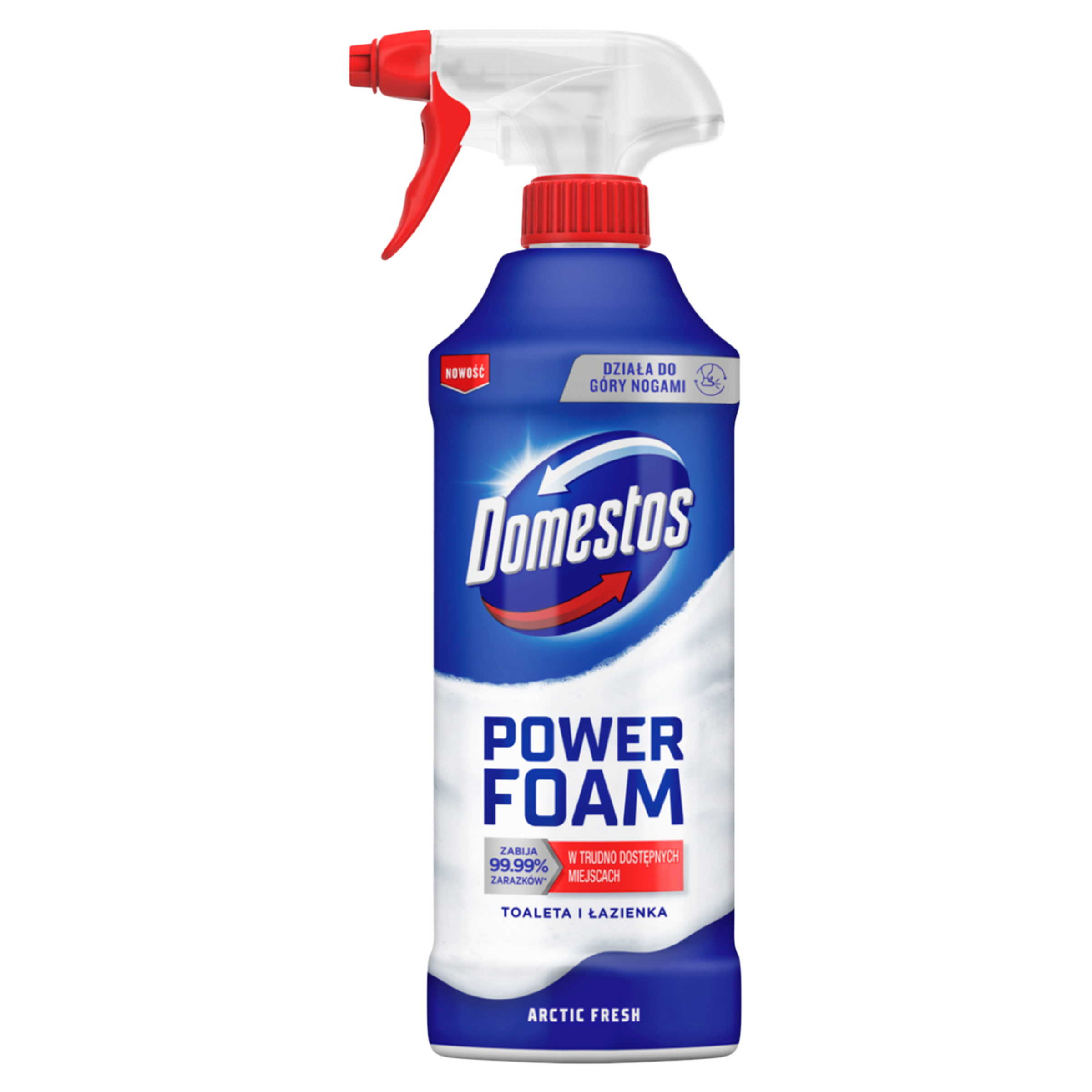 Pianka Domestos Power Foam Arctic Fresh w formie wygodnego sprayu działa również w pozycji do góry nogami, dzięki czemu szybko i skutecznie dociera do trudno dostępnych miejsc.