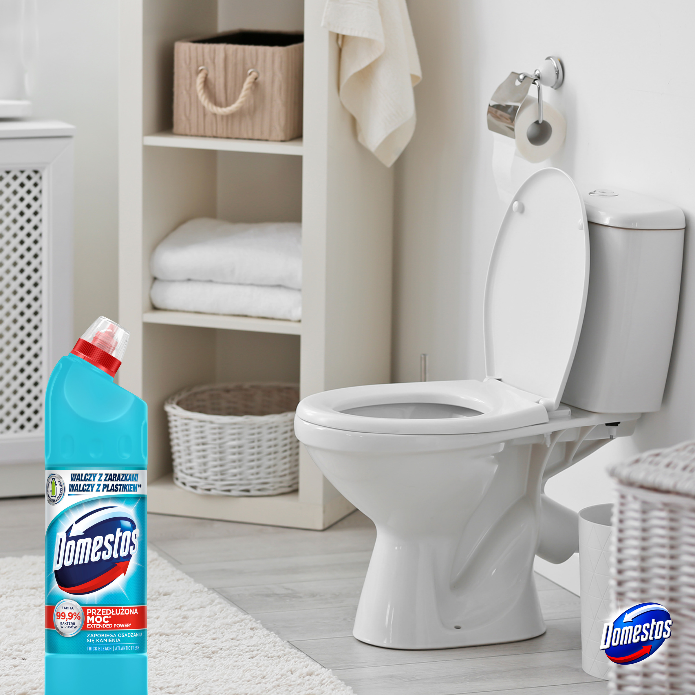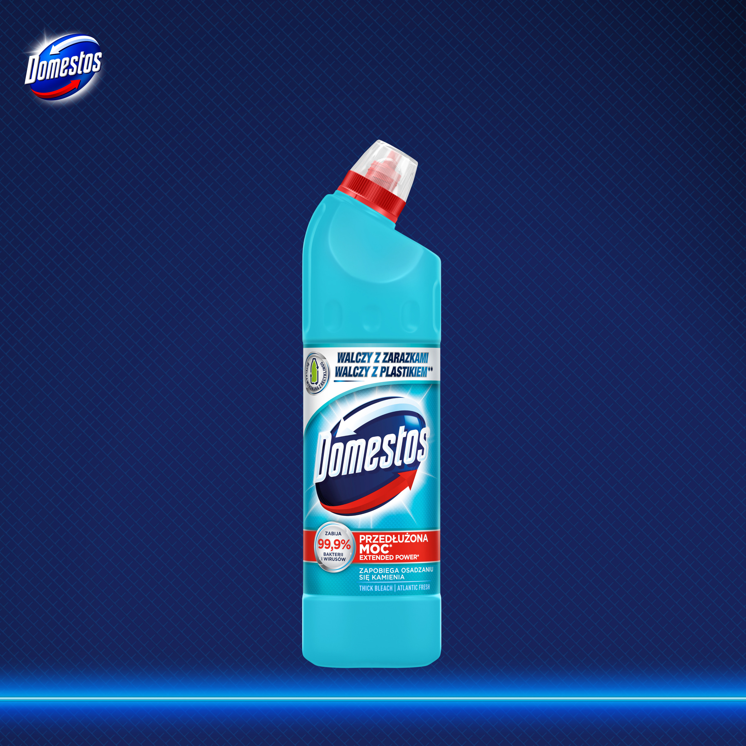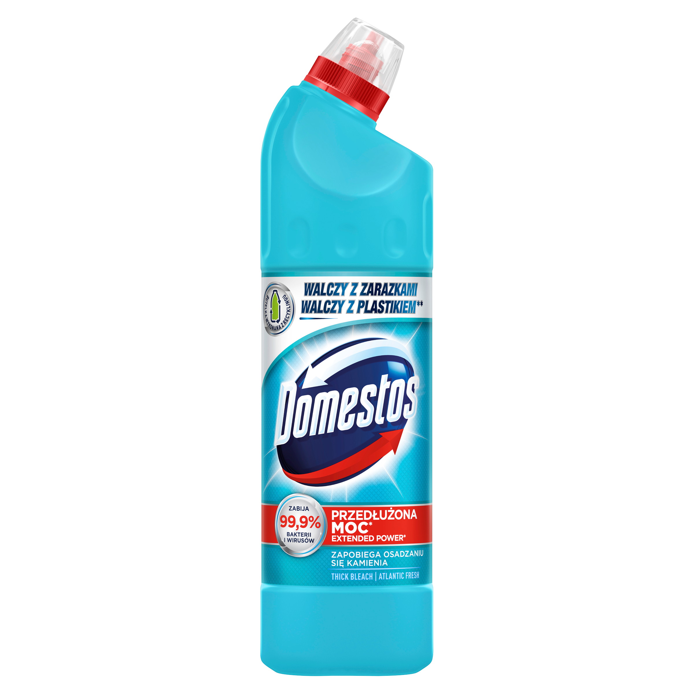 Domestos Przedłużona Moc Atlantic Fresh to bezwzględny chlorowy płyn z aktywnymi cząsteczkami, który nie tylko czyści i chroni toaletę przed zarazkami, ale także skutecznie zapobiega osadzaniu się kamienia w muszli toaletowej.