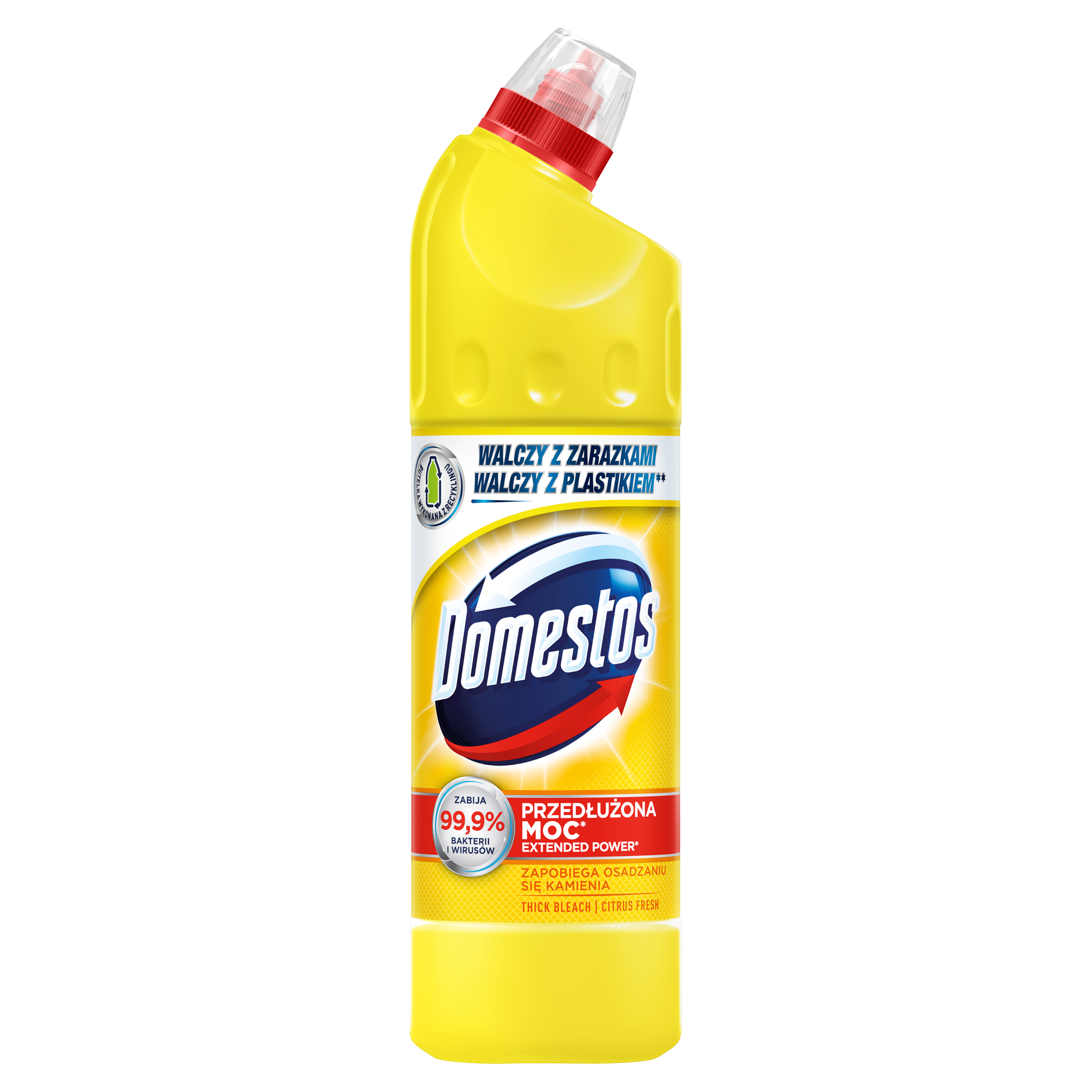 Domestos Przedłużona Moc Citrus Fresh to bezwzględny chlorowy płyn z aktywnymi cząsteczkami, który nie tylko czyści i chroni toaletę przed zarazkami, ale także skutecznie zapobiega osadzaniu się kamienia w muszli toaletowej.