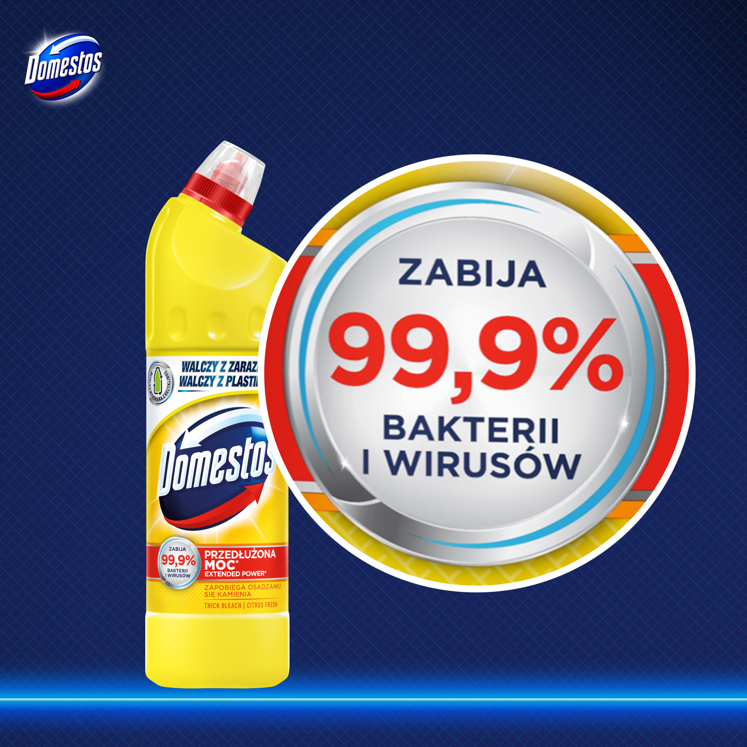 Co powiesz na produkt, który skróci czas sprzątania, wyeliminuje 99,9% bakterii i wirusów i pozostawi toaletę świeżą i czystą? Wśród środków do czyszczenia toalety płyn do czyszczenia toalet Domestos Przedłużona Moc Citrus Fresh to zdecydowany lider, z którym trudno konkurować.