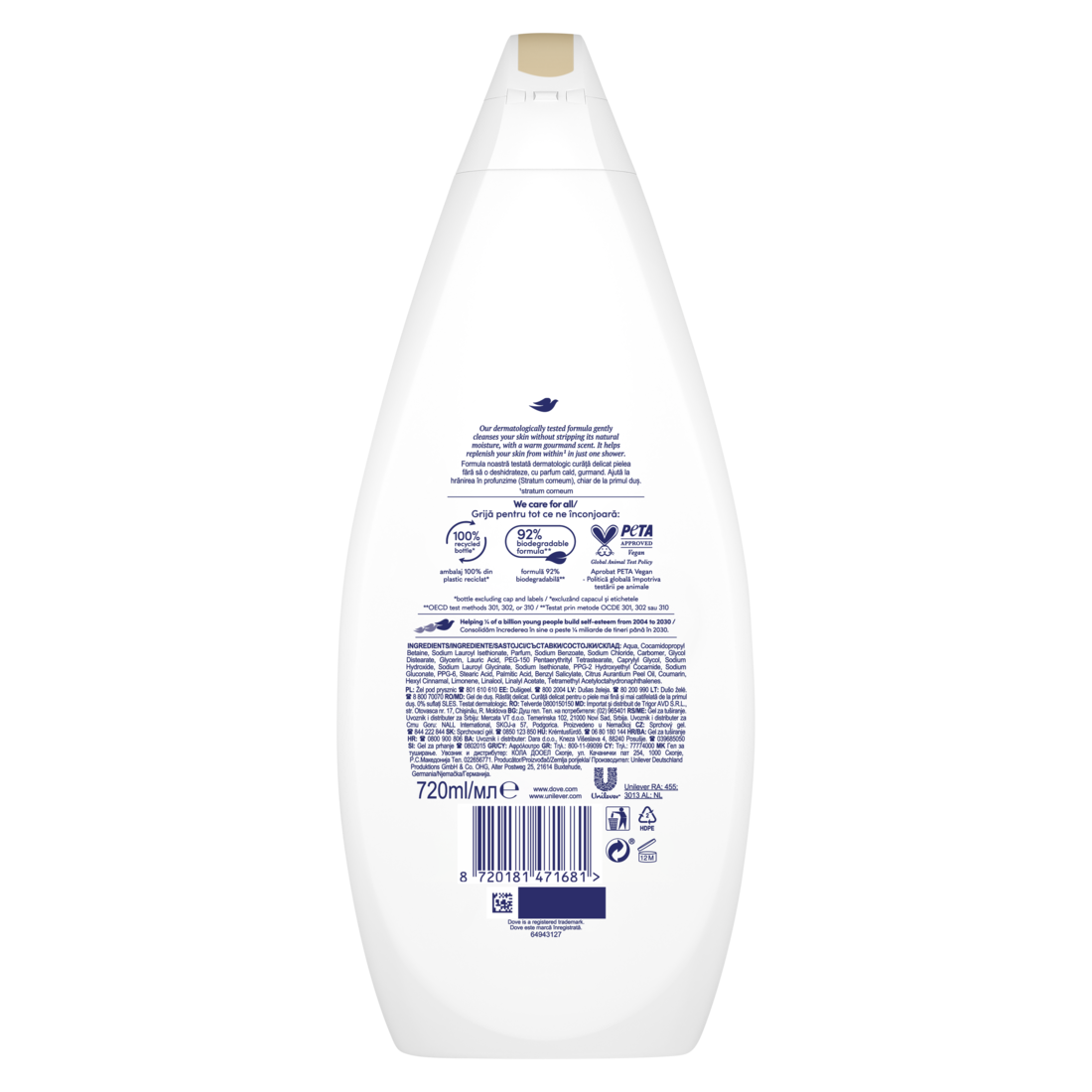 Oprócz troski o Twoją skórę i ciało, Dove troszczy się również o planetę. Żel do mycia ciała wyróżnia się aż w 92% biodegradowalną formułą, a jego butelka pochodzi w 100%* z PCR. Ponadto produkt posiada certyfikat PETA approved Vegan, a to oznacza, że nie został on poddany testom na zwierzętach.