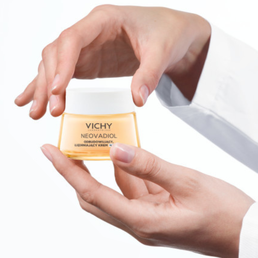 VICHY NEOVADIOL KOMPLEKS UZUPEŁNIAJĄCY Odbudowujący, ujędrniający krem na dzień dla skóry suchej. Modeluje owal twarzy, wygładza zmarszczki, poprawia sprężystość skóry. Zmiany hormonalne po 45. roku życia przyspieszają proces starzenia się skóry, powodując utratę elastyczności i gęstości skóry oraz owalu twarzy. VICHY NEOVADIOL KOMPLEKS UZUPEŁNIAJĄCY Odbudowujący, ujędrniający krem na dzień reaktywuje mechanizmy skórne: poprawia elastyczność i jędrność skóry, zmniejsza suchość