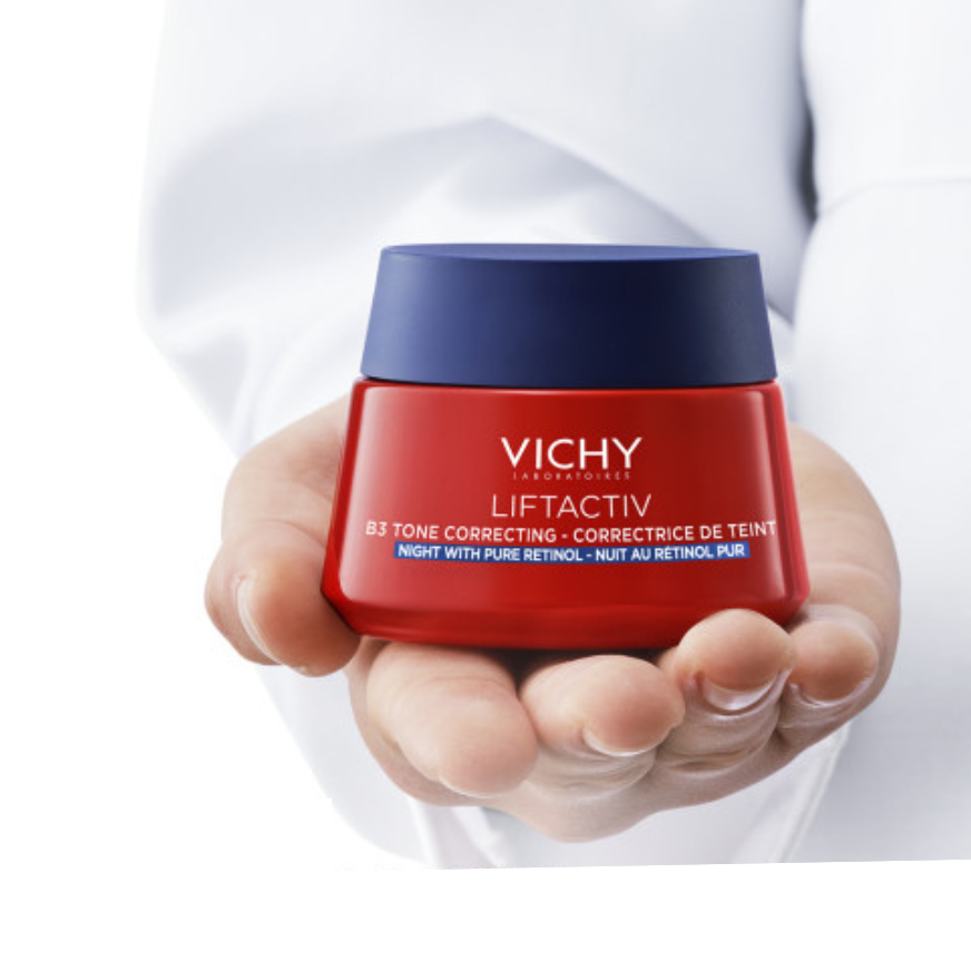 Zaawansowana pielęgnacja redukująca przebarwienia i wygładzająca zmarszczki. Dzięki opatentowanej technologii Laboratoria Vichy połączyły po raz pierwszy ze sobą stabilną formę 0,15% czystego retinolu oraz 4% niacynamidu tworząc przełomową kombinację aktywnych składników działających w nocy jak nigdy dotąd na odnowę komórkową skóry.
