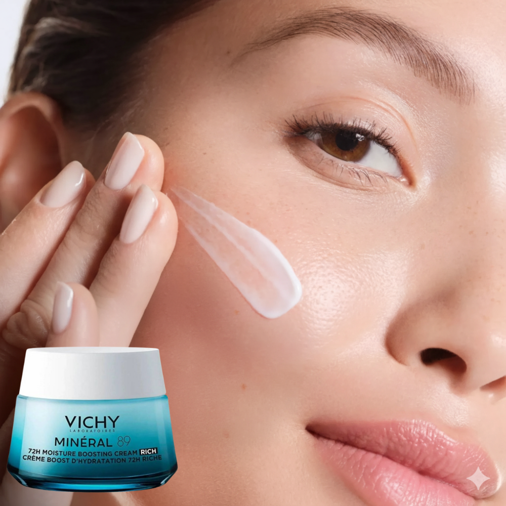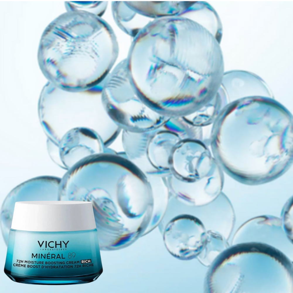 Bogaty krem nawilżająco-odbudowujący Vichy Mineral 89 to idealne rozwiązanie dla przesuszonej, przewrażliwionej cery, potrzebującej silnego nawilżenia i odbudowy. Składniki aktywne zawarte w kremie Vichy Mineral 89 przywracają prawidłowy poziom nawodnienia, dzięki czemu pozostaje ona dobrze nawilżona aż do 100 godzin. Dzięki skutecznej penetracji naskórka, kosmetyk odbudowuje funkcje obronne skóry, podnosząc jej odporność na drażniące działanie czynników zewnętrznych.