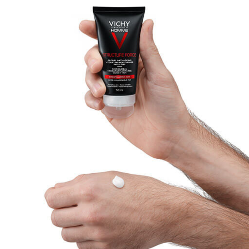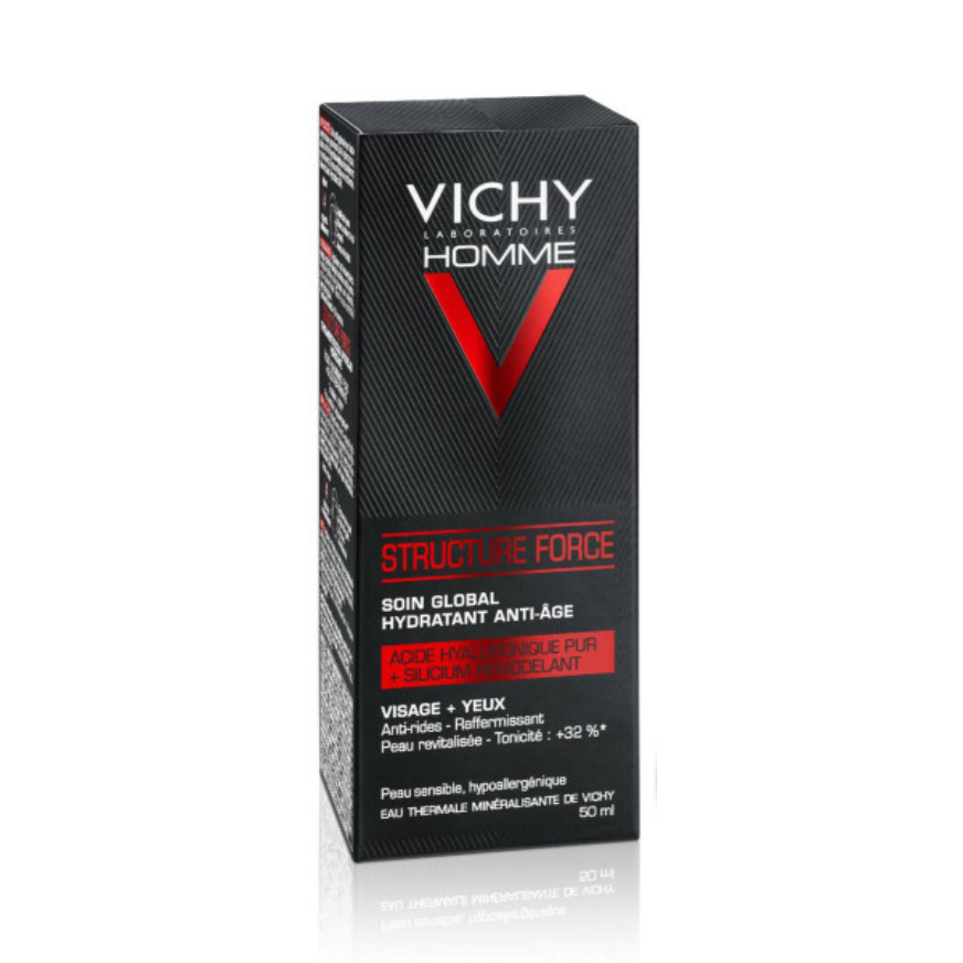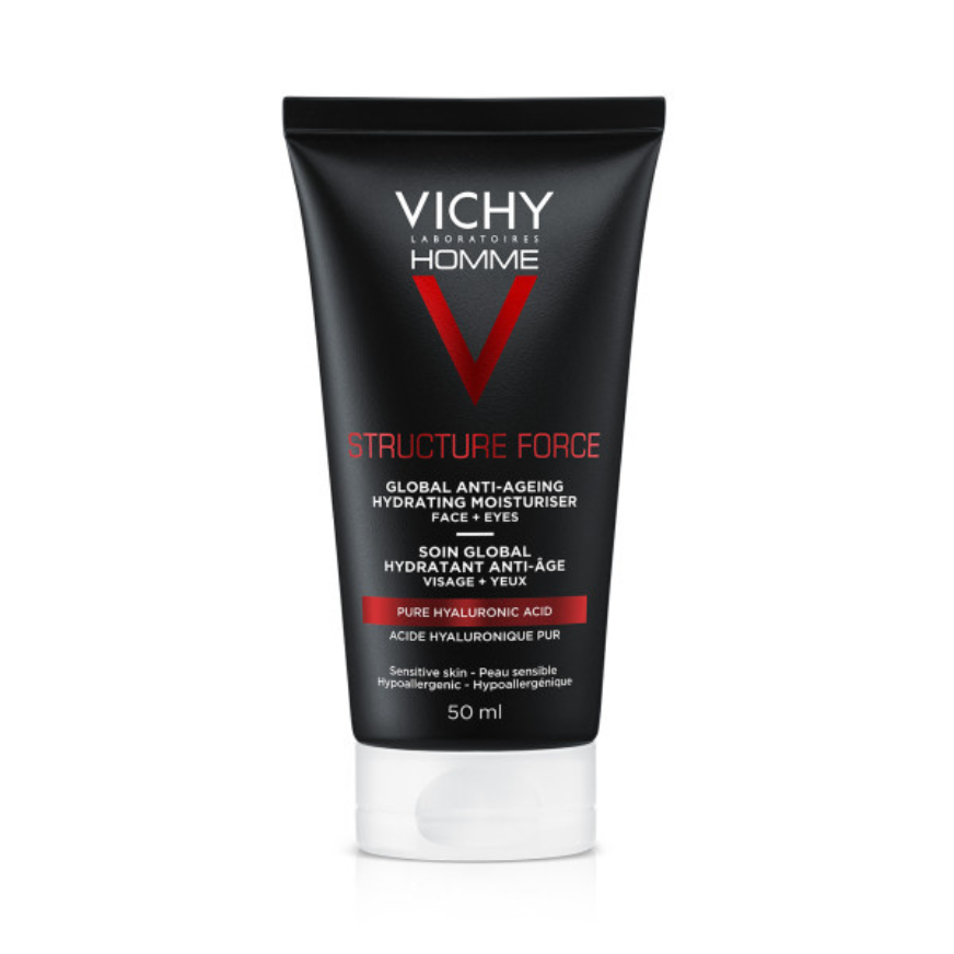 VICHY HOMME STRUCTURE FORCE to kompleksowa pielęgnacja przeciwzmarszczkowa dopasowana do wrażliwej skóry mężczyzn. Krem można stosować zarówno na skórę twarzy jak i skórę wokół oczu. Działa na 4 oznaki starzenia się skóry: utratę jędrności, pojawiające się zmarszczki wokół oczu, strukturę skóry i opadający kontur twarzy. Hipoalergiczny – testowany pod kontrolą dermatologiczną i okulistyczną.