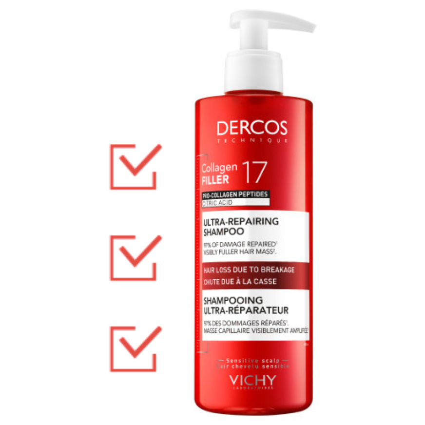INNOWACJA: Pierwsza ultra-regenerująca rutyna pielęgnacyjna DERCOS do włosów i skóry głowy. Wzbogacona o kwas cytrynowy i pro-kolagenowe peptydy, które wspomagają wytwarzanie kolagenu 17*, aby wzmacniać włókno włosa, zapobiegając wypadaniu włosów z powodu ich łamliwości.